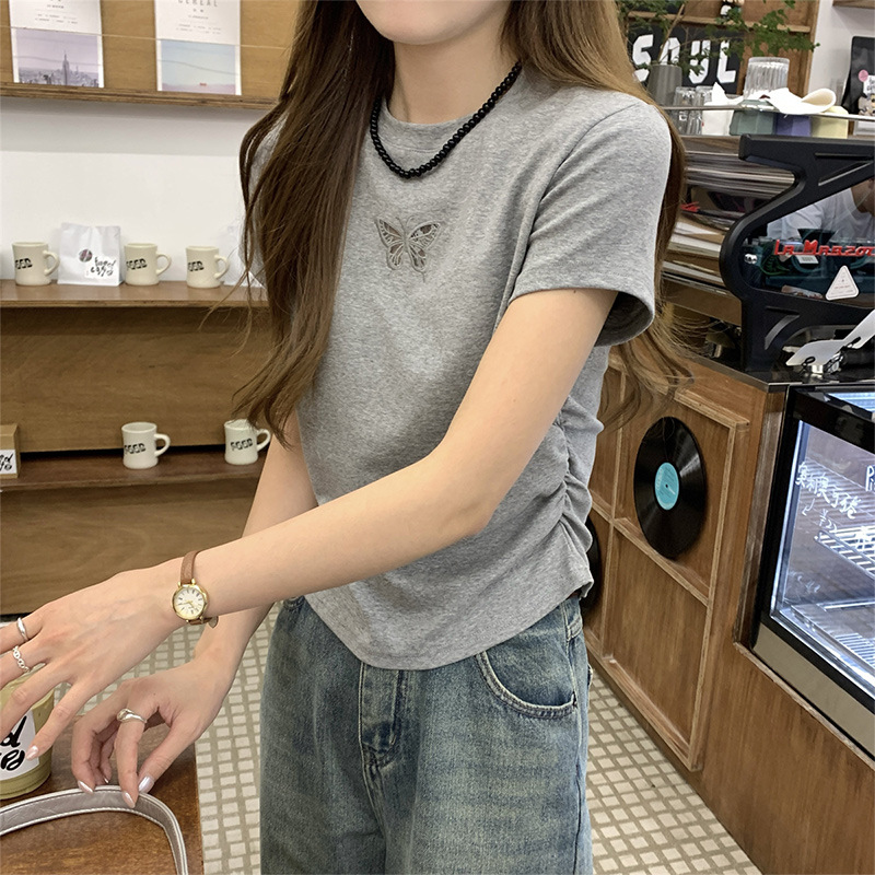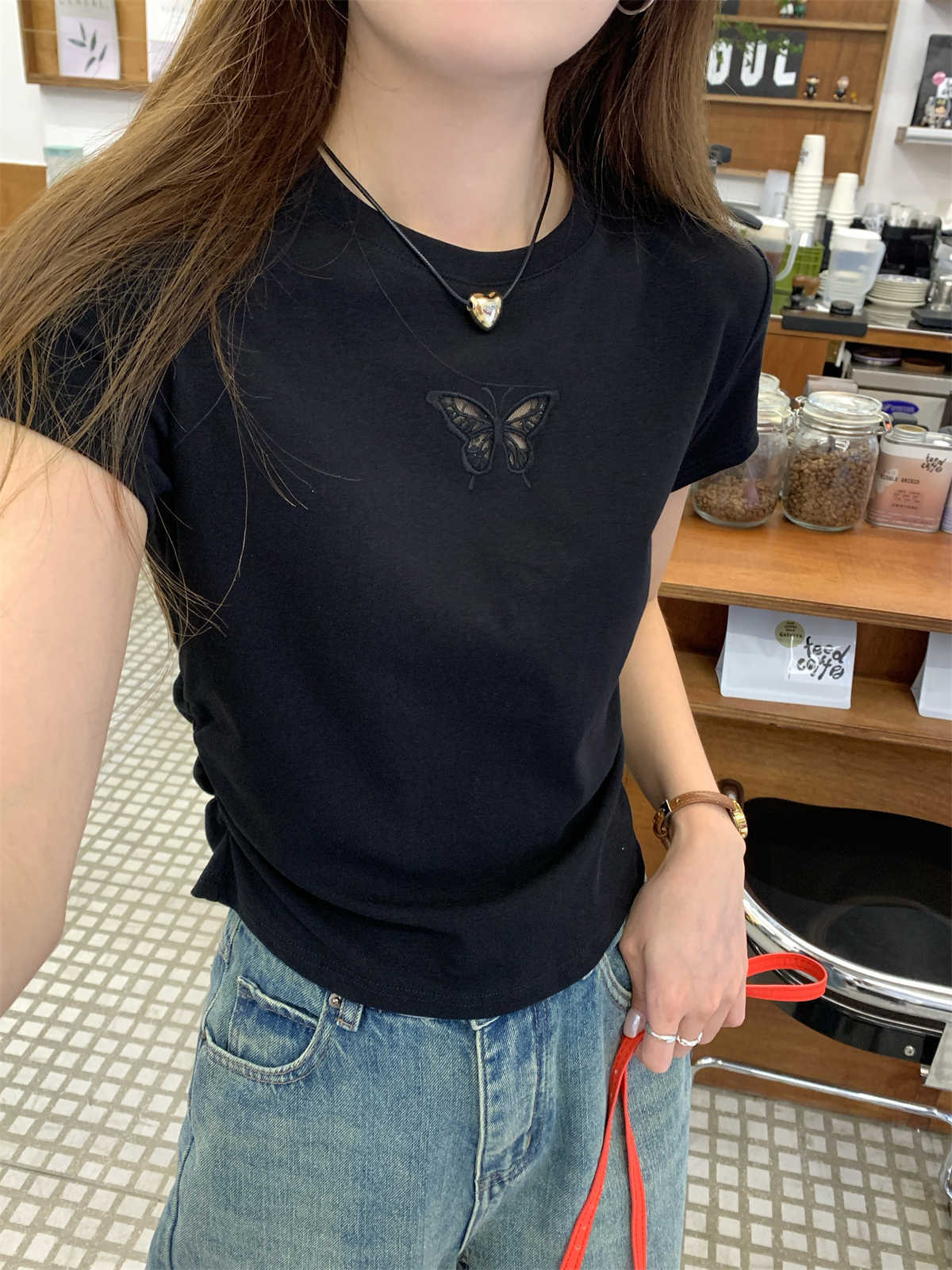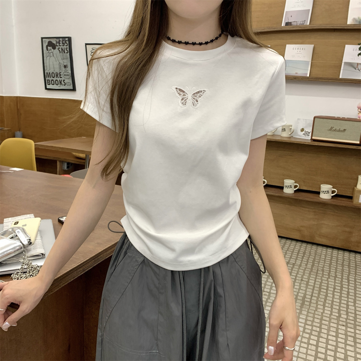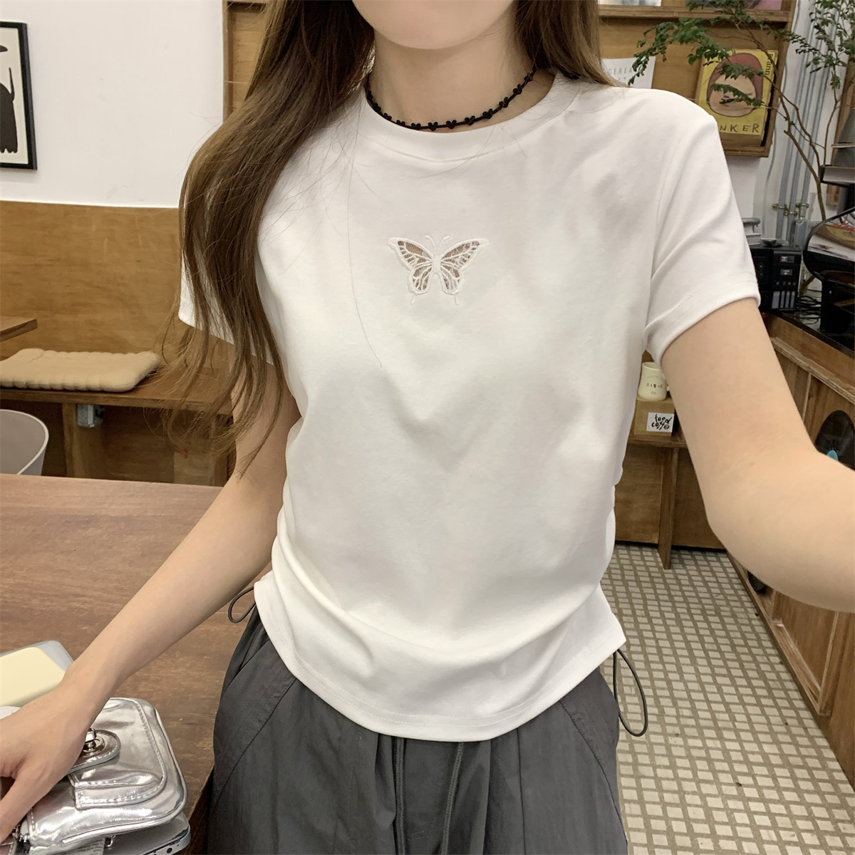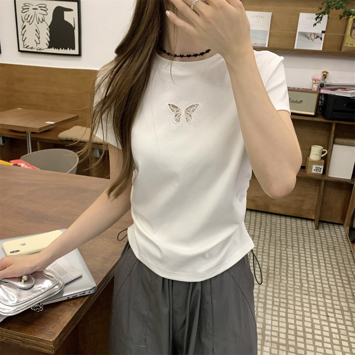 时尚百搭夏季新款韩系抽褶设计感小众镂空蝴蝶别致正肩短袖女