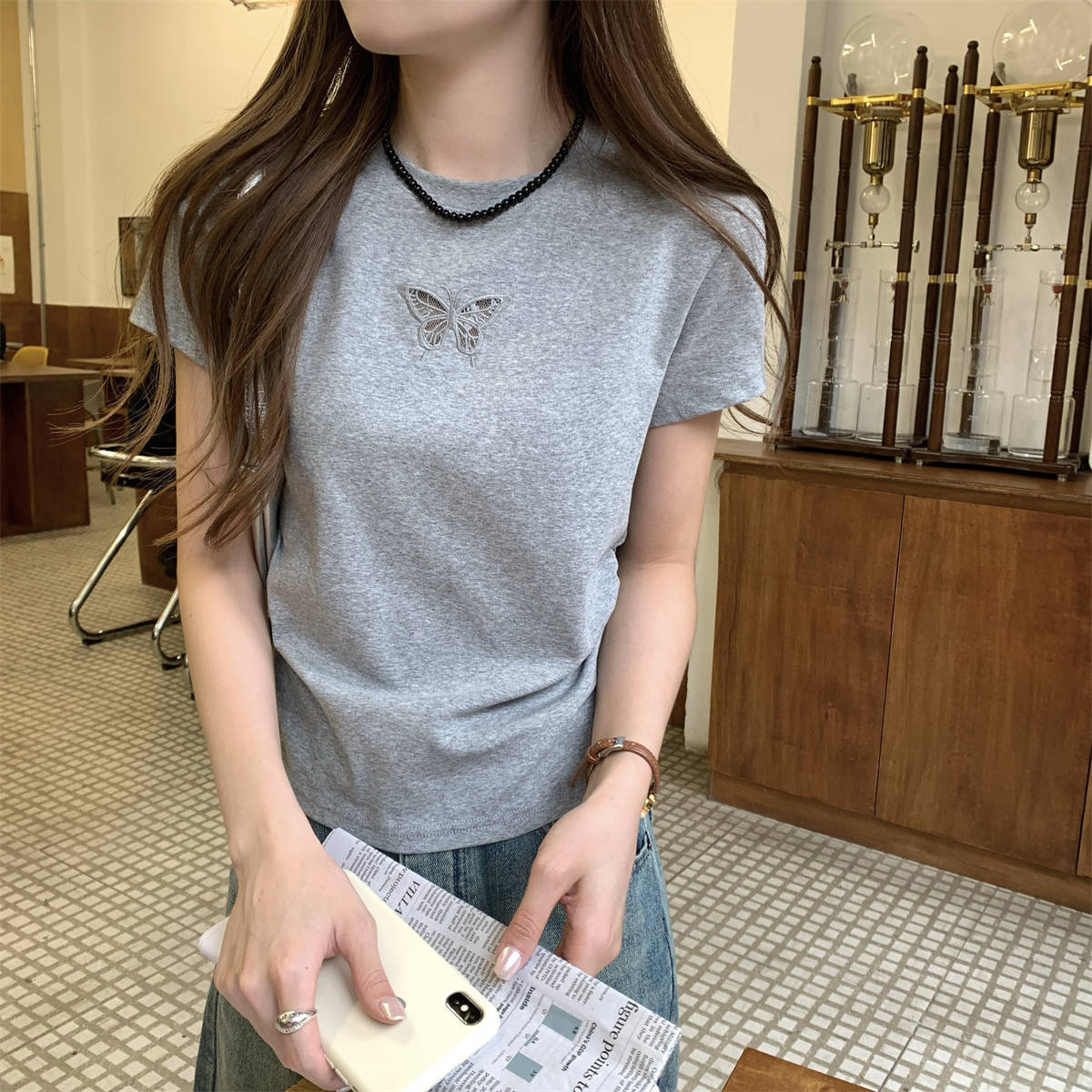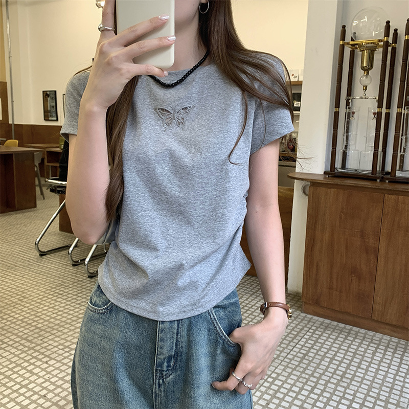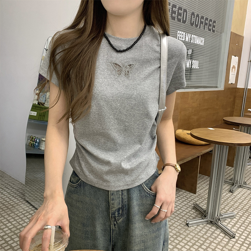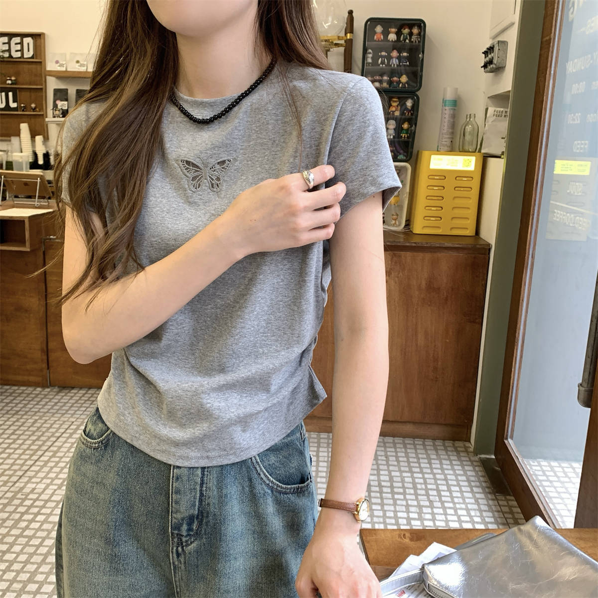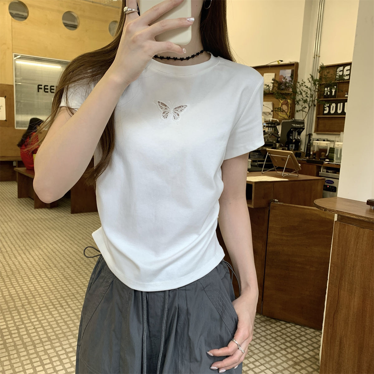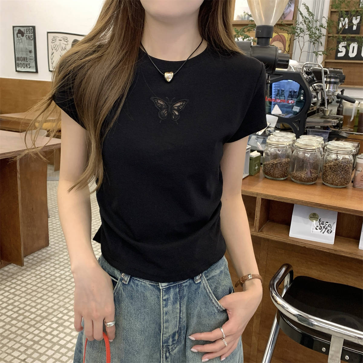 时尚百搭夏季新款韩系抽褶设计感小众镂空蝴蝶别致正肩短袖女