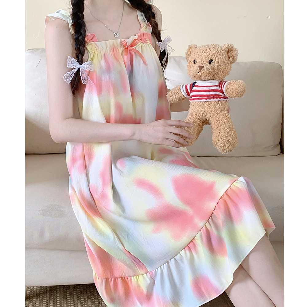 吊带睡裙带胸垫女夏纯棉中长款扎染家居服夏天学生甜美大码家居服