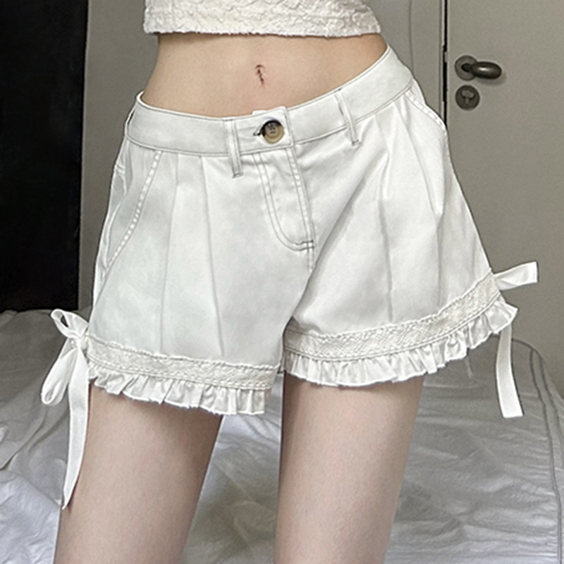 夏季新款蝴蝶结花边短裤女百搭白色宽松阔腿裤工装休闲热裤