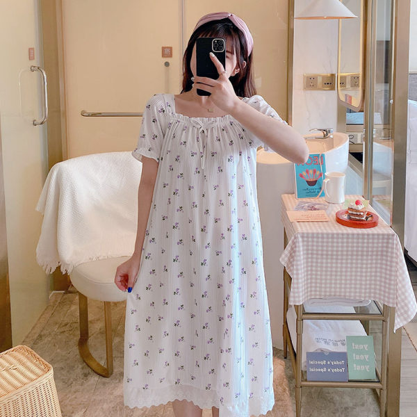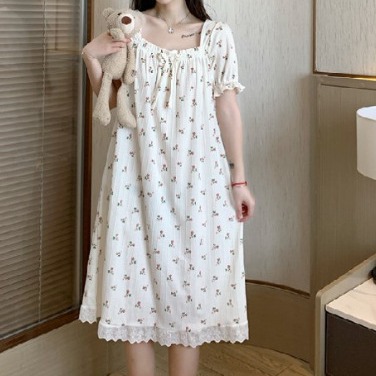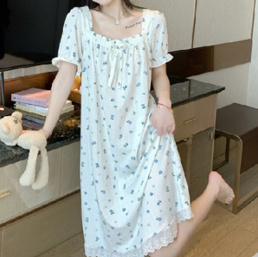 夏季甜美田园风小碎花短袖睡裙女中长款花边蕾丝少女家居服可外穿