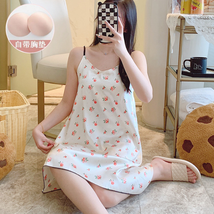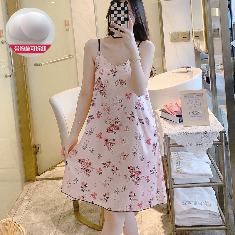 冰丝睡衣女夏季甜美带胸垫吊带睡裙可爱少女学生居家中长款可外穿