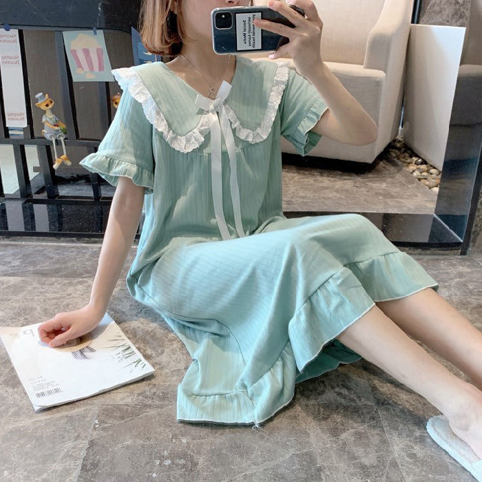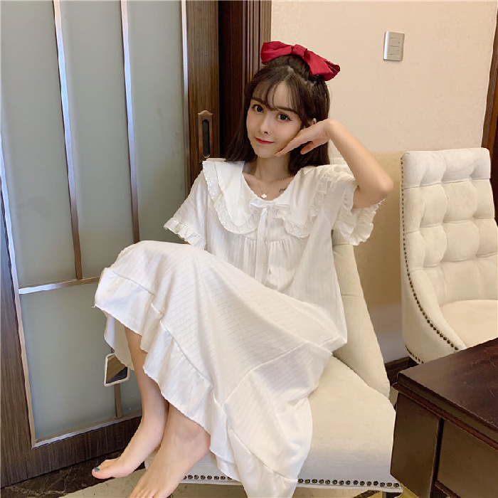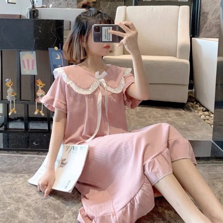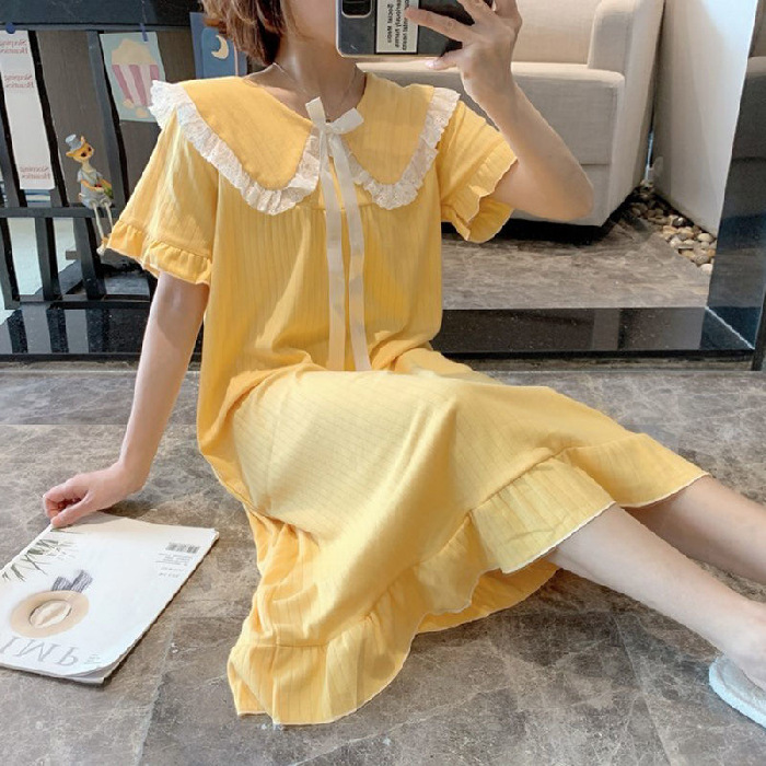 公主风夏季短袖花边睡裙女甜美学生宽松娃娃领家居服