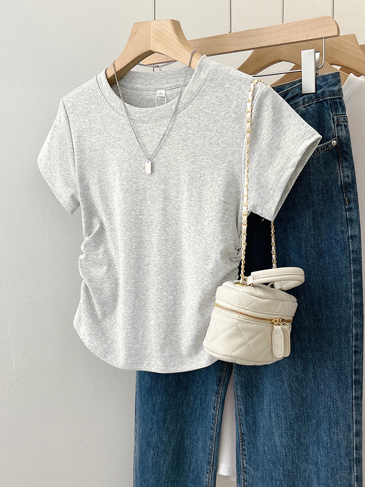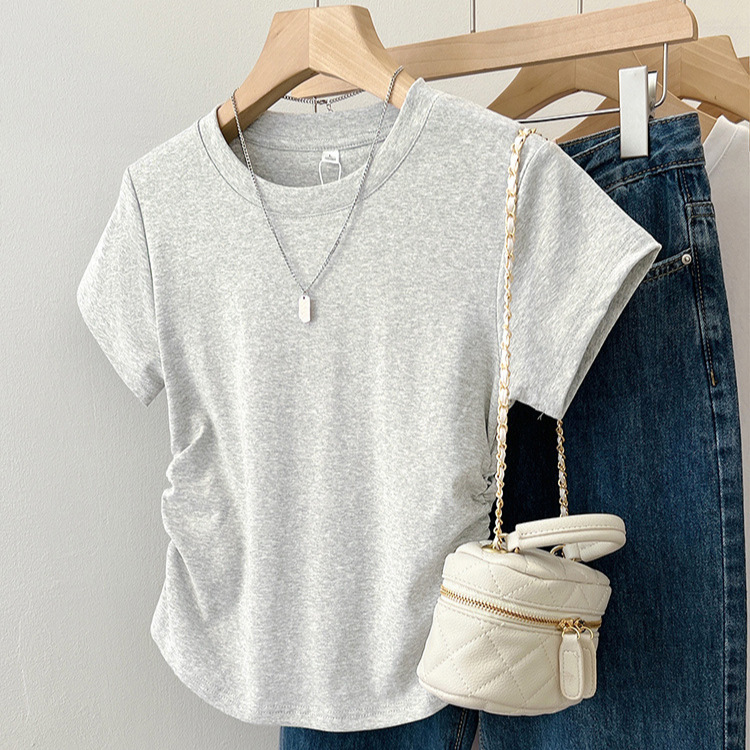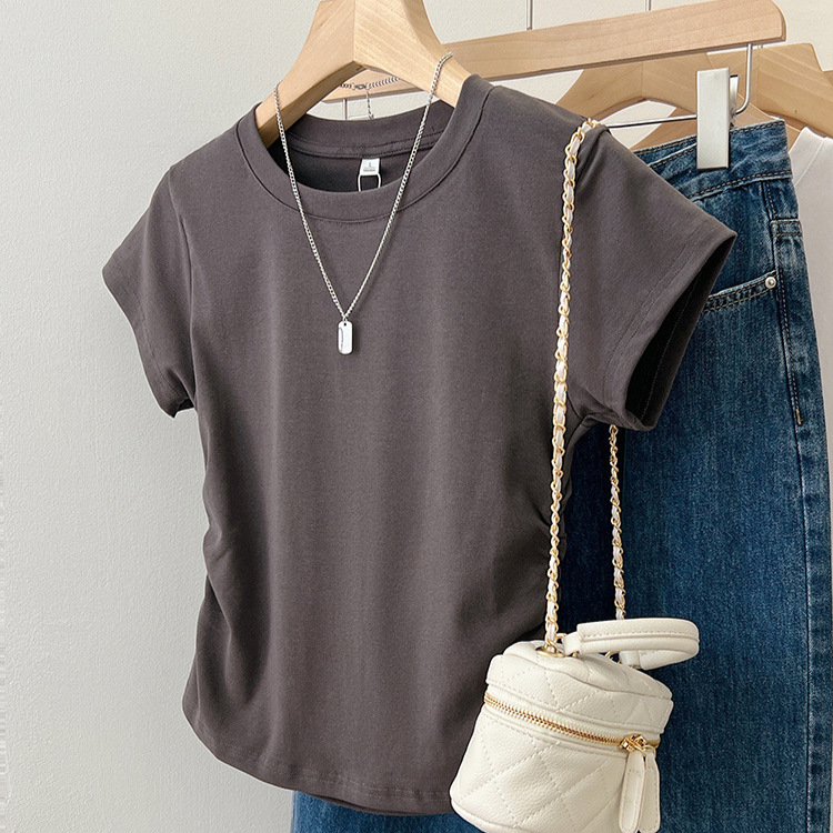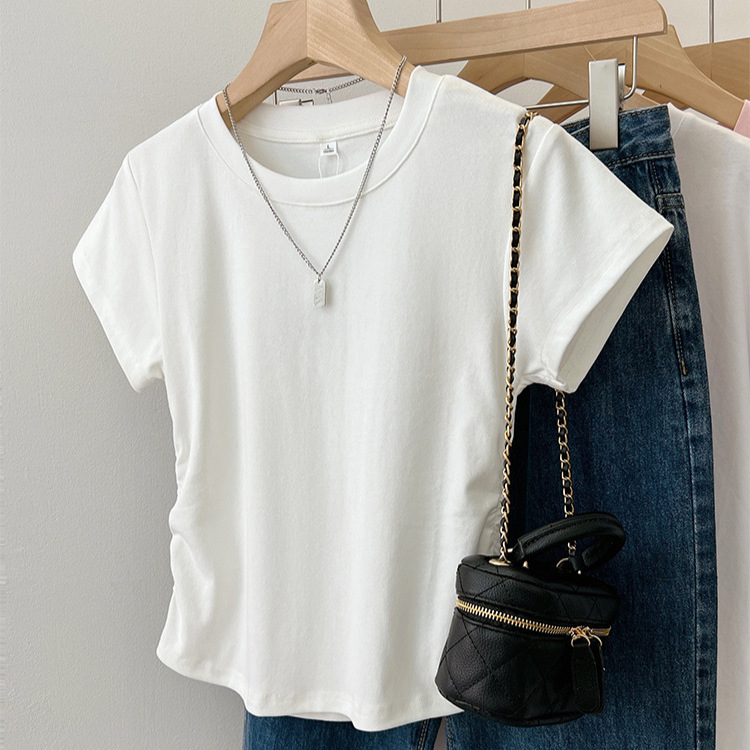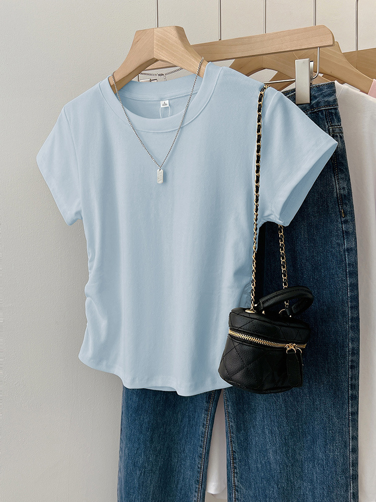 奶蓝色掐腰褶皱小衫女夏季韩系独特减龄上衣显瘦正肩短袖T恤