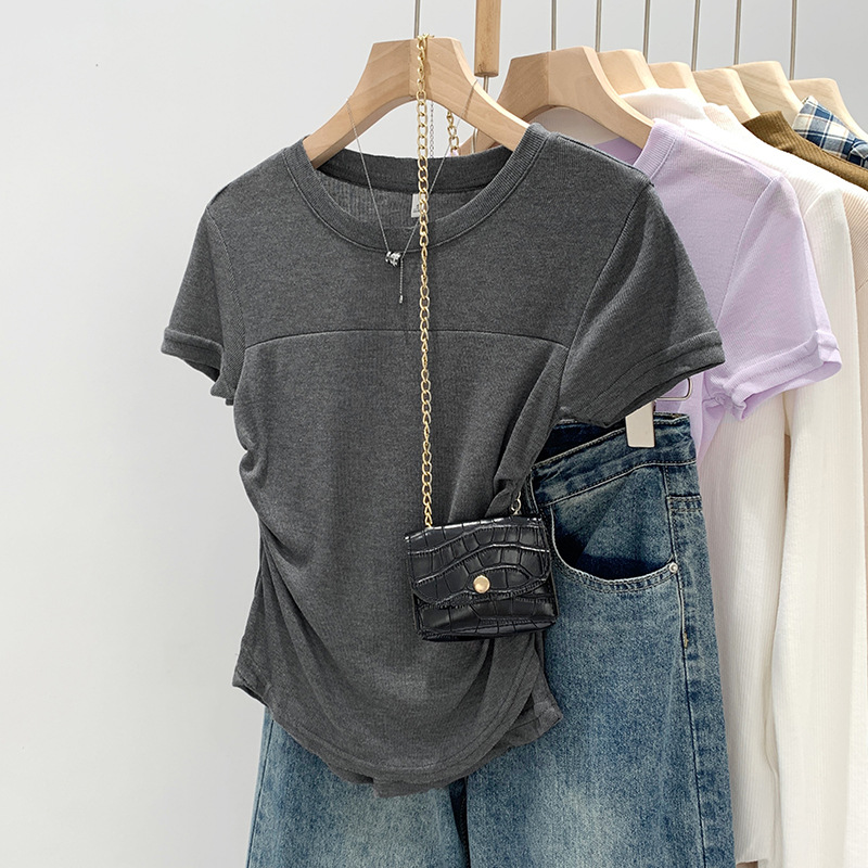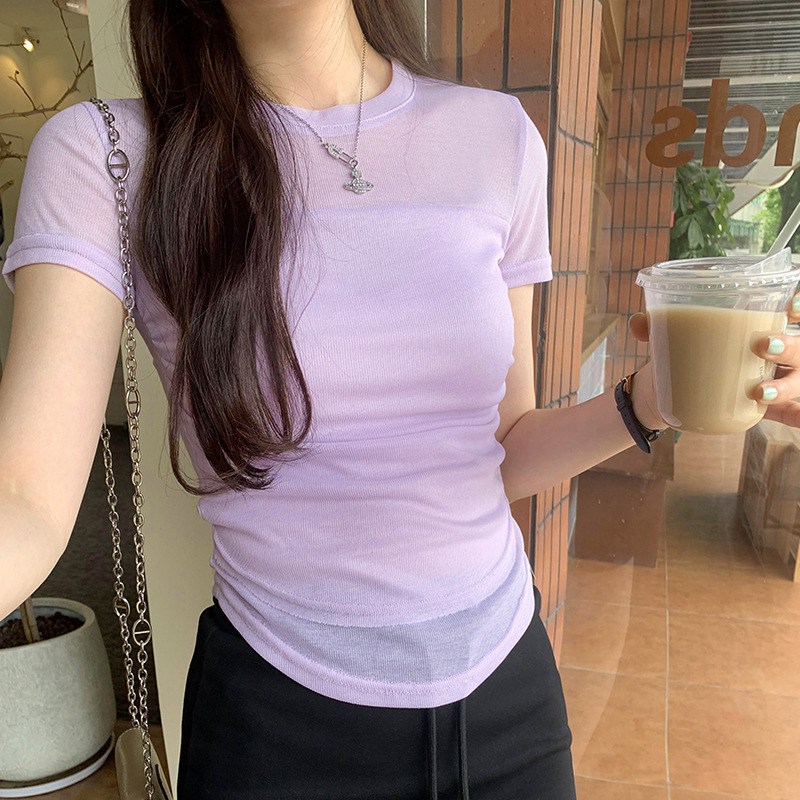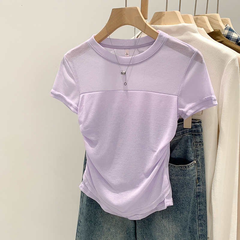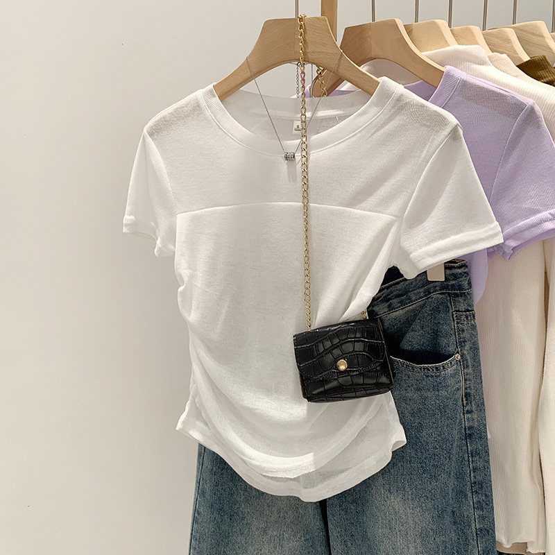 法式辣妹薄纱拼接褶皱设计感收腰显瘦正肩短袖独特T恤夏新款