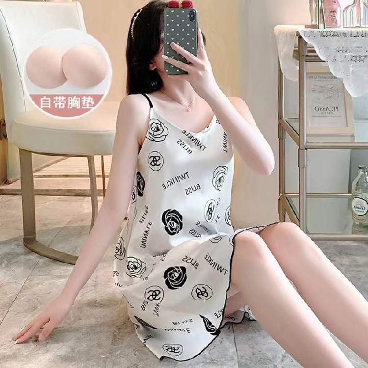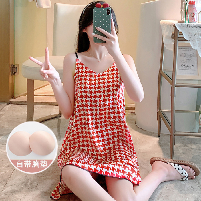 仿真丝夏季千鸟格吊带睡裙女士带胸垫宽松性感家居服