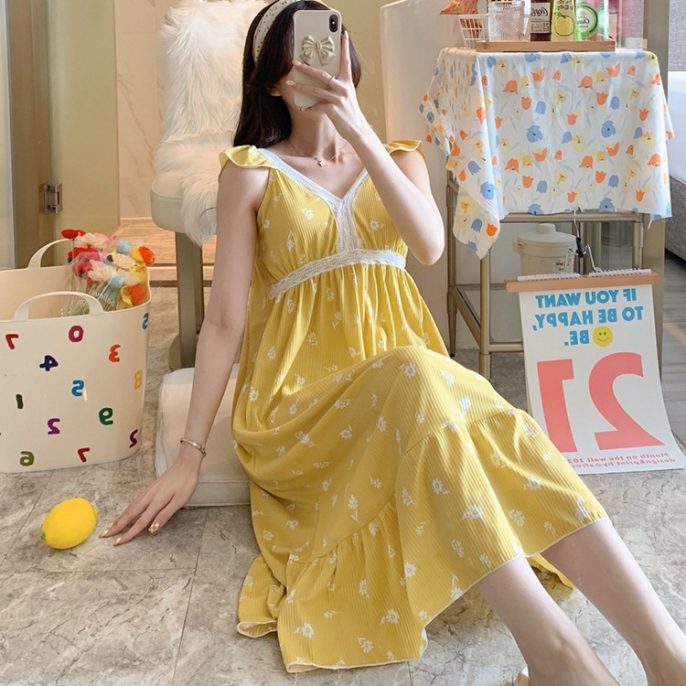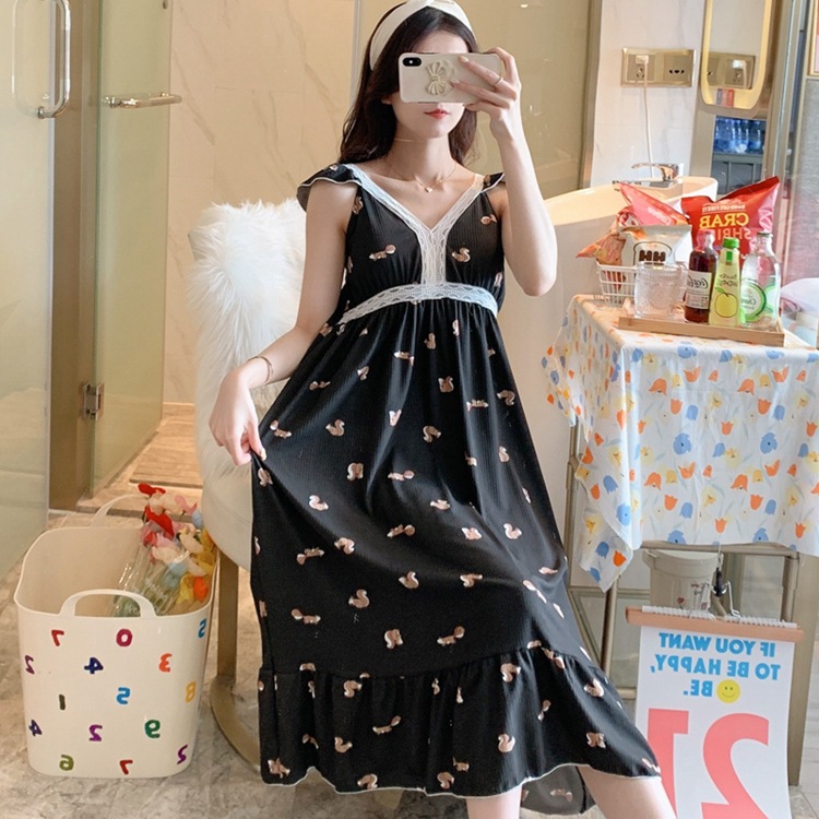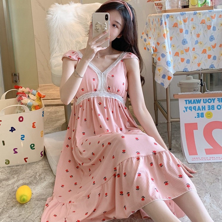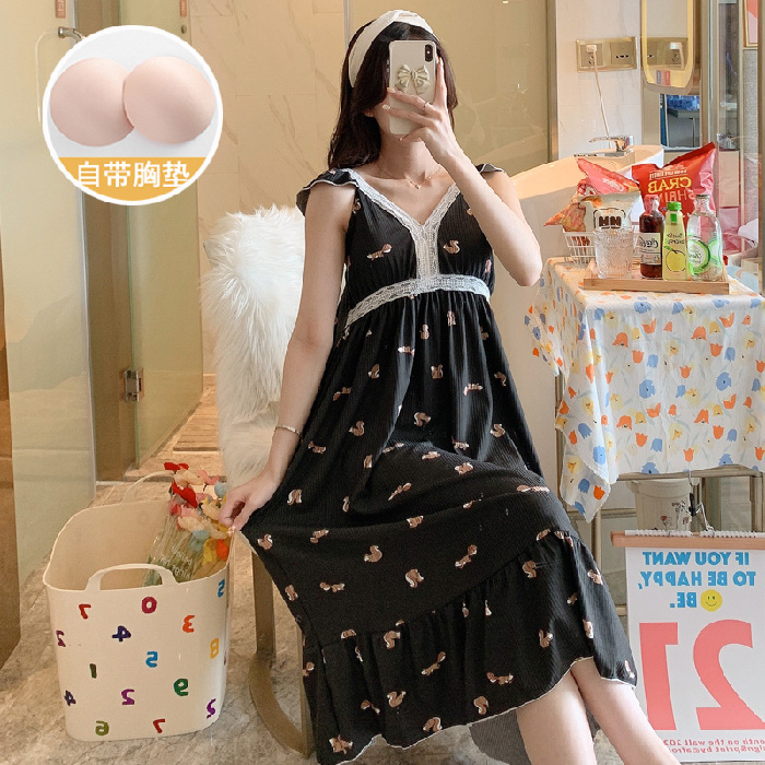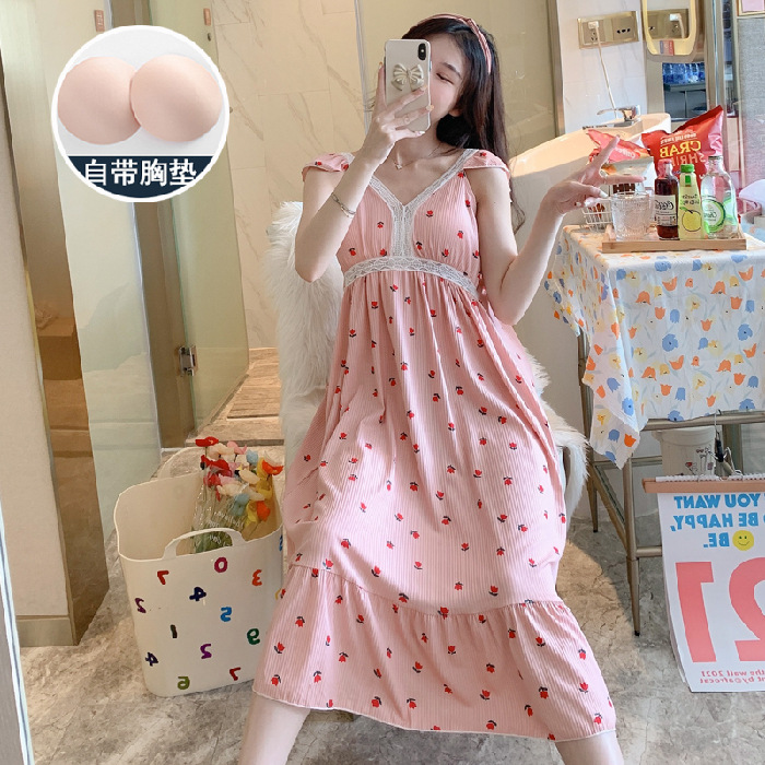 夏季蕾丝v领吊带睡裙女中长款加肥加大胖MM可穿牛奶丝带胸垫