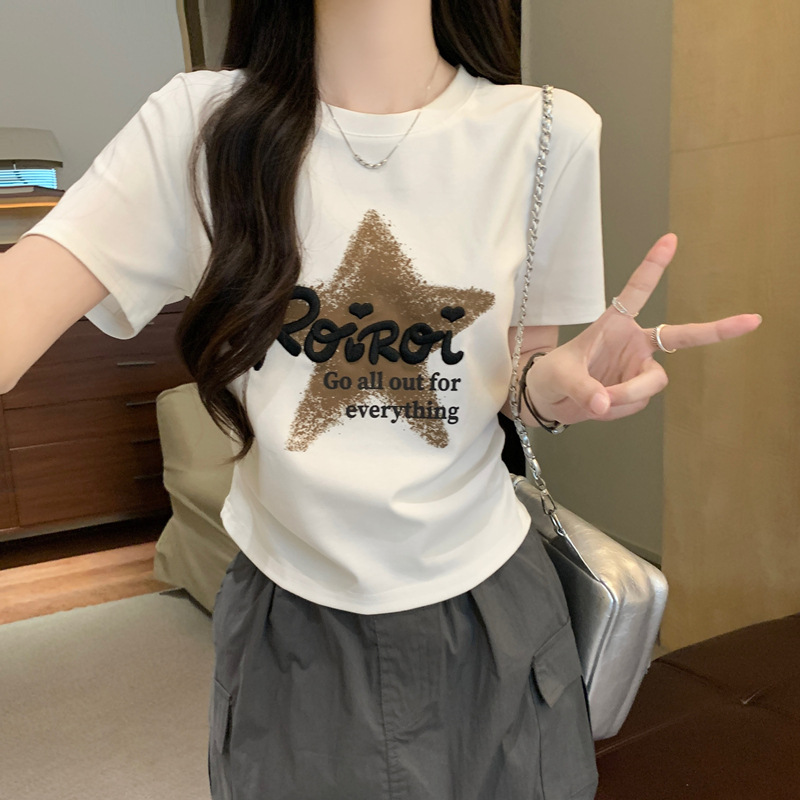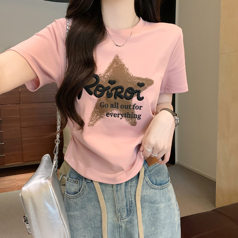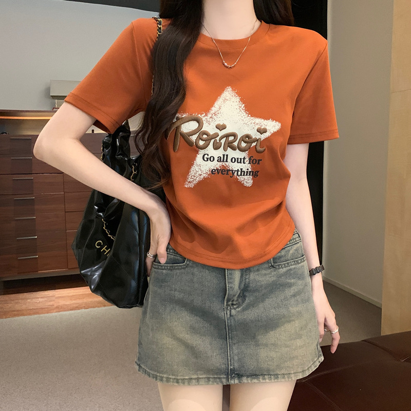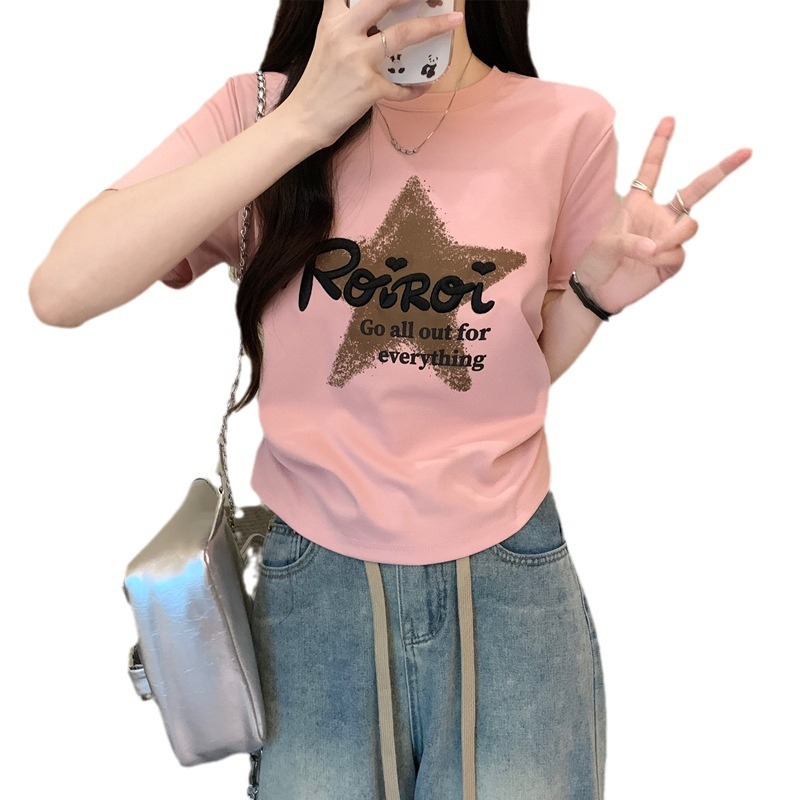 印花圆领短袖T恤女夏季新款棉百搭体恤修身洋气收腰短款上衣