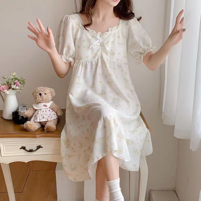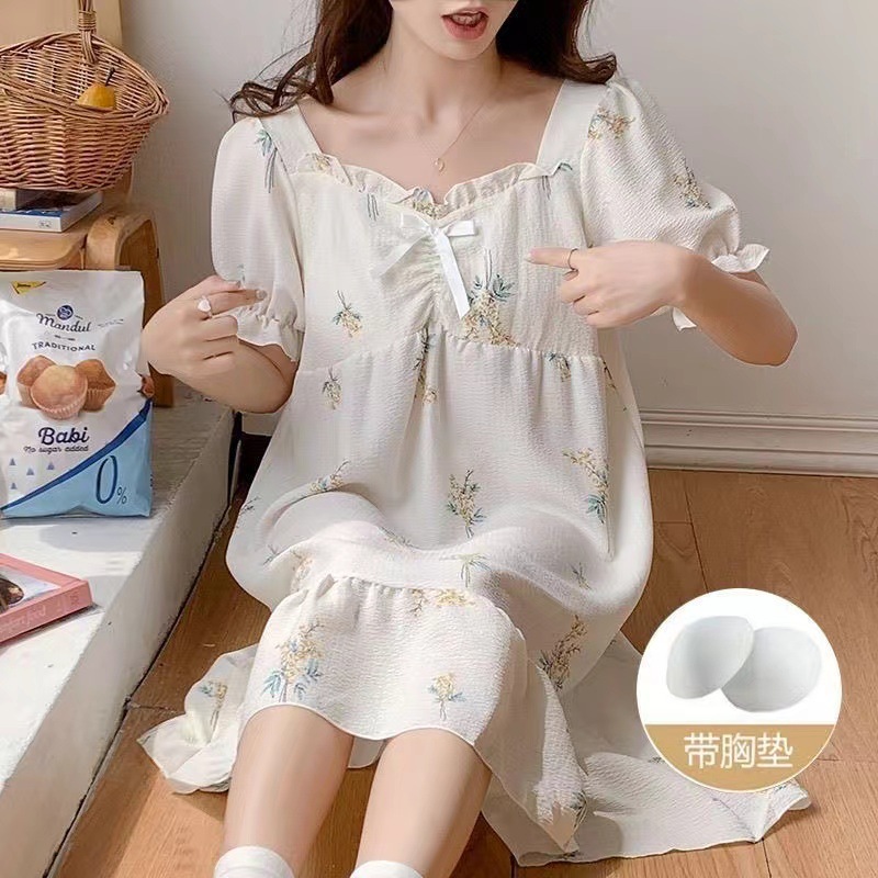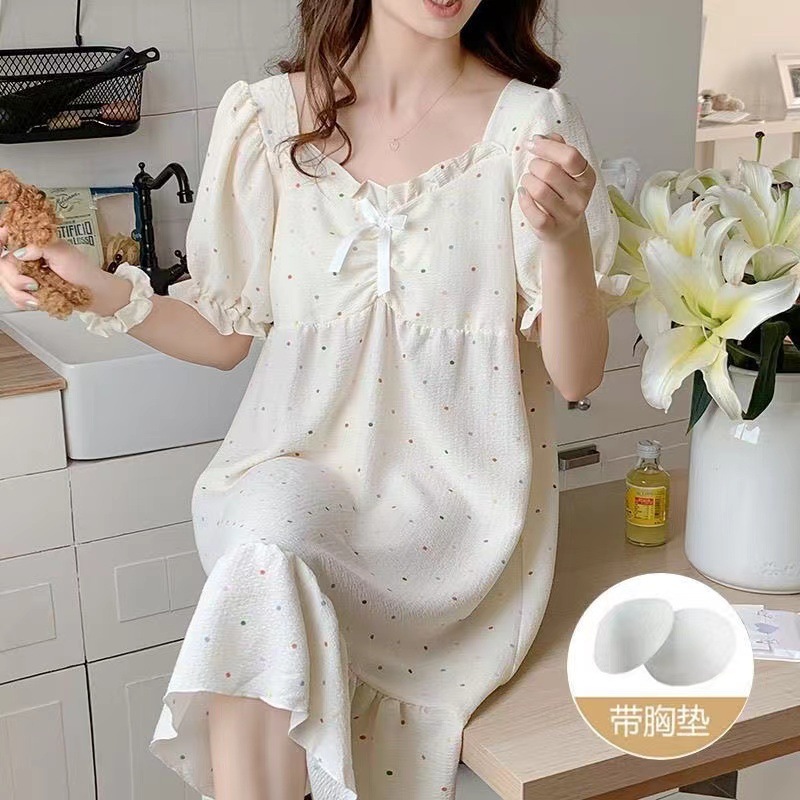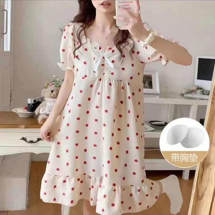 甜美夏季带胸垫泡泡棉短袖睡裙女中长宽松v领学生居家少女可外穿