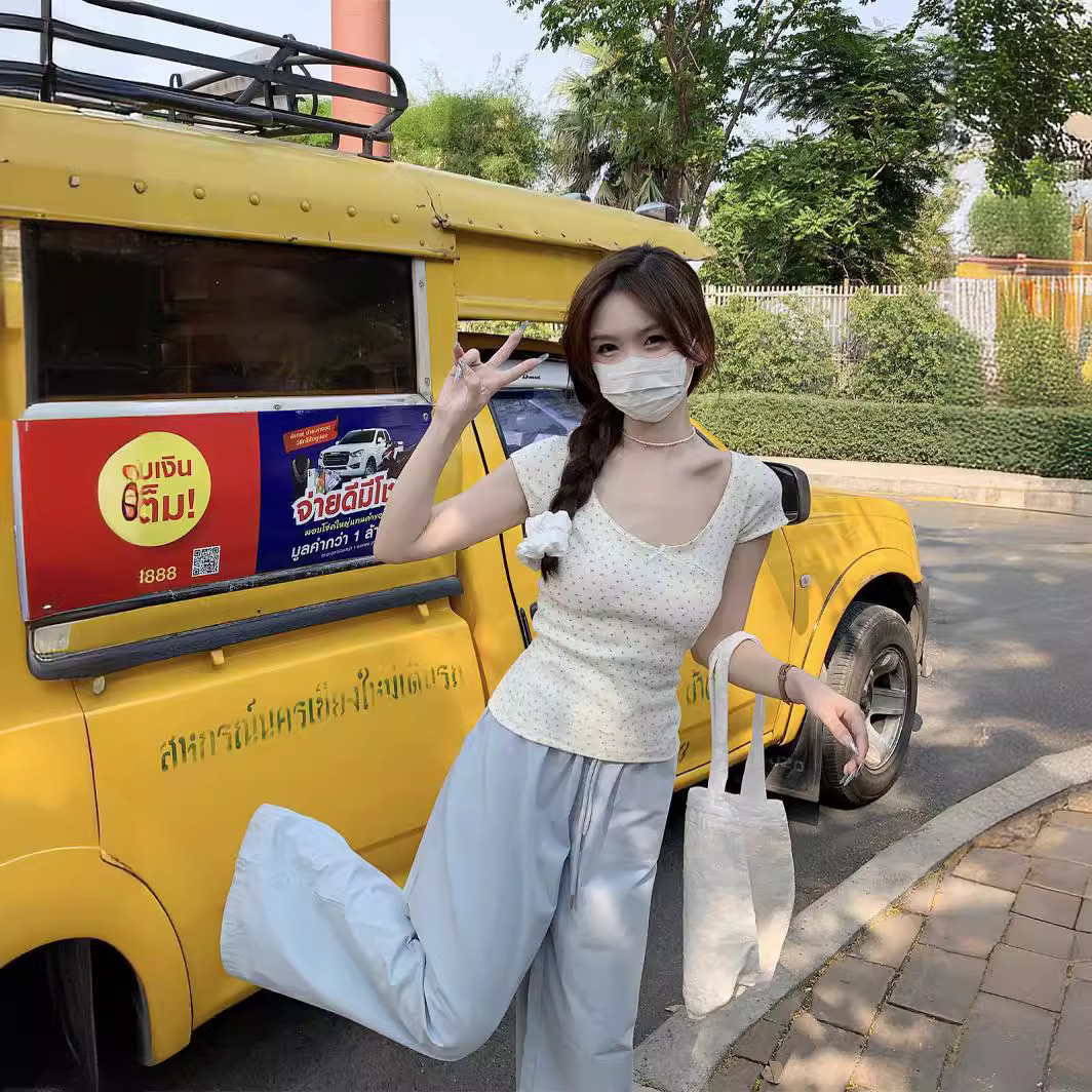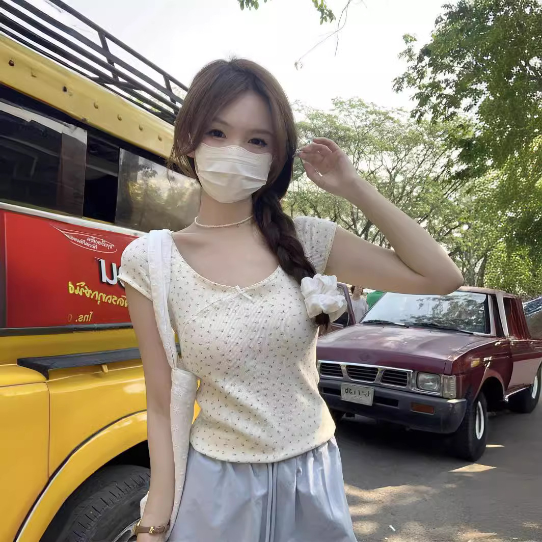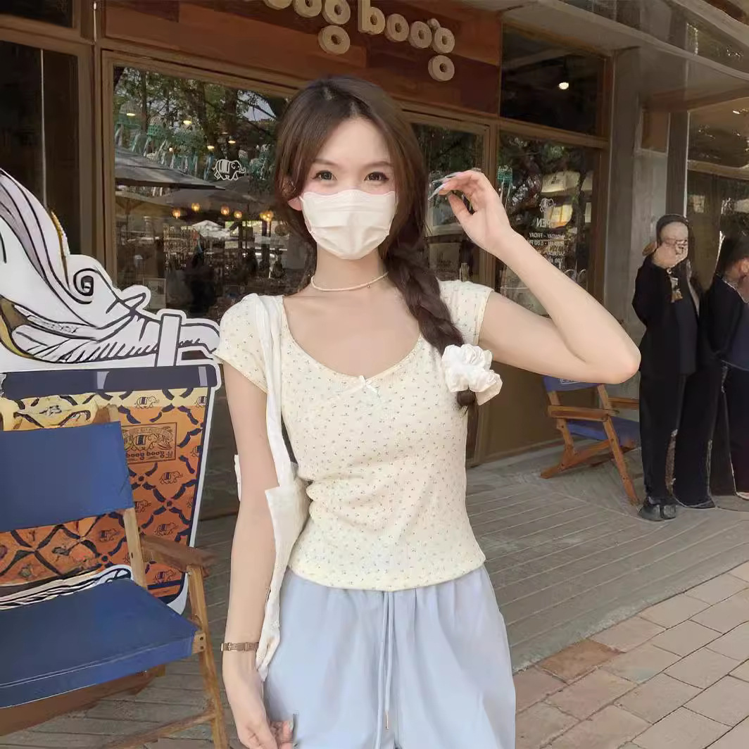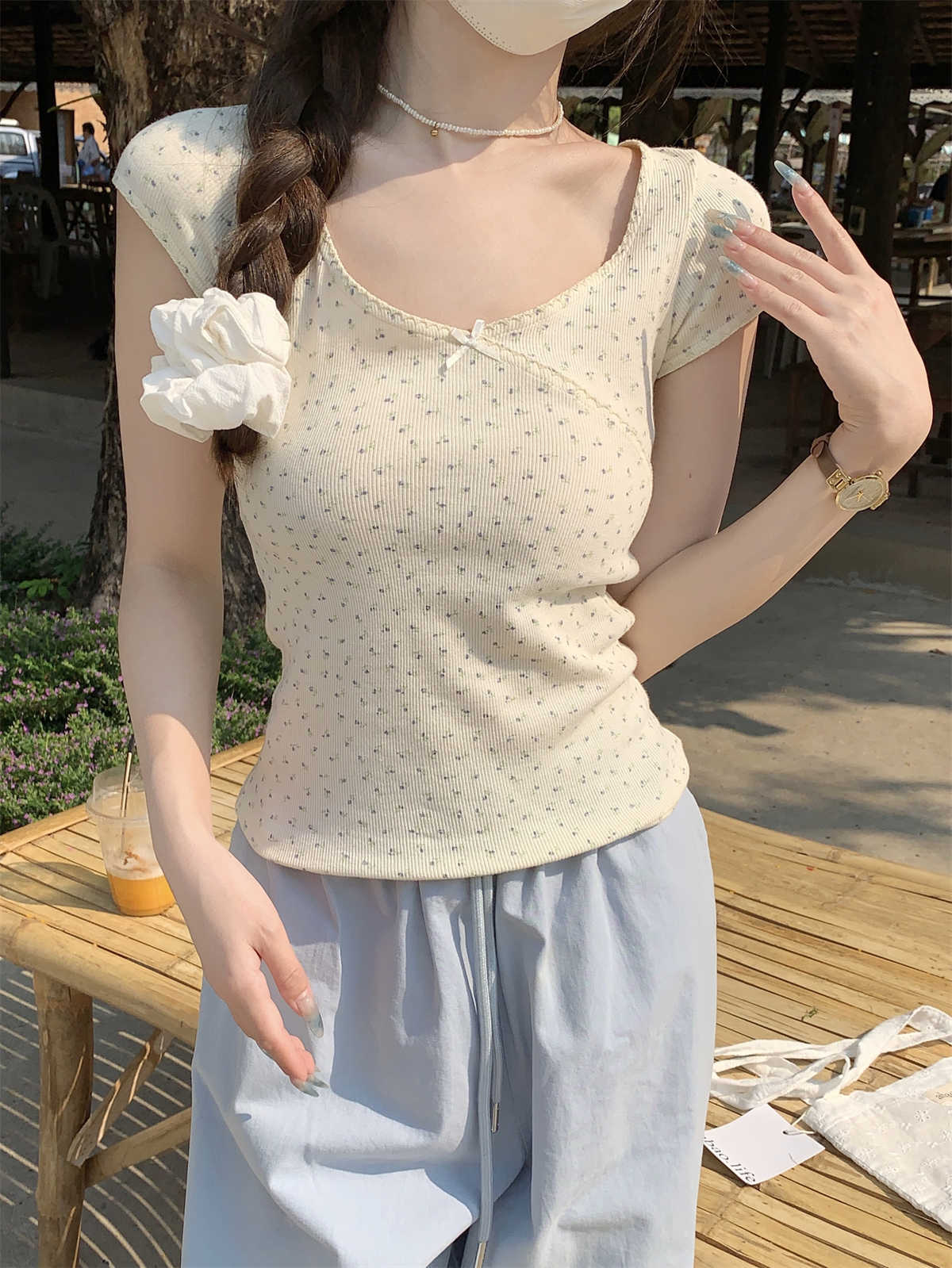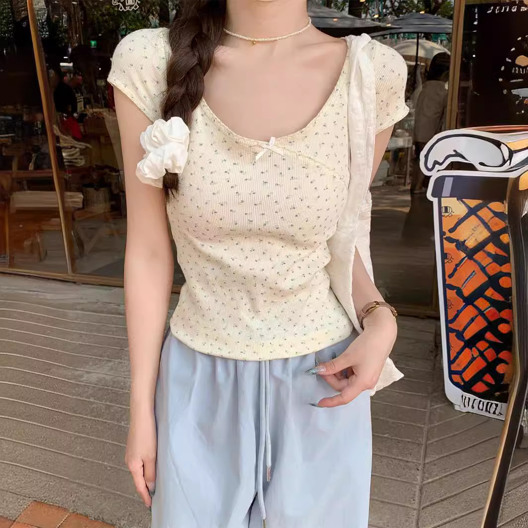 韩系减龄chic碎花U领短袖女夏季新款蝴蝶结纯欲风正肩T恤上衣