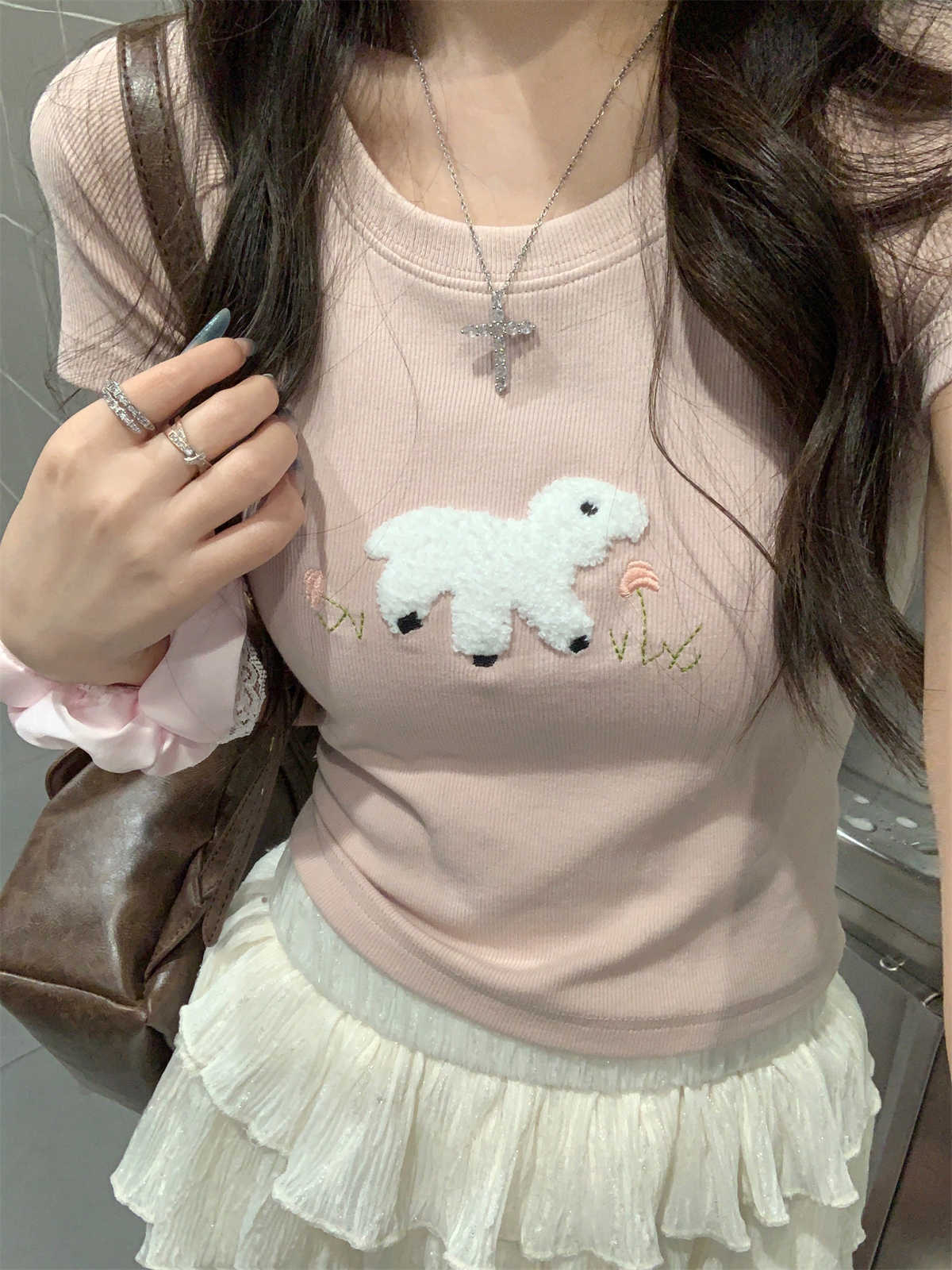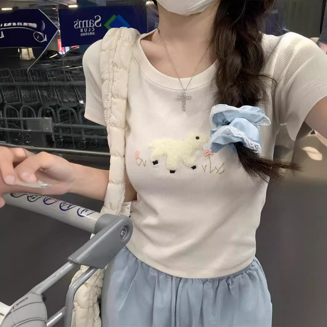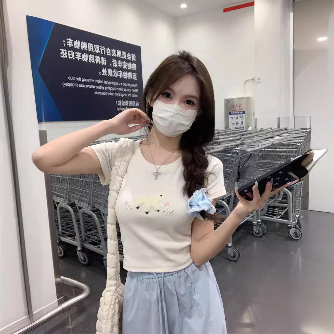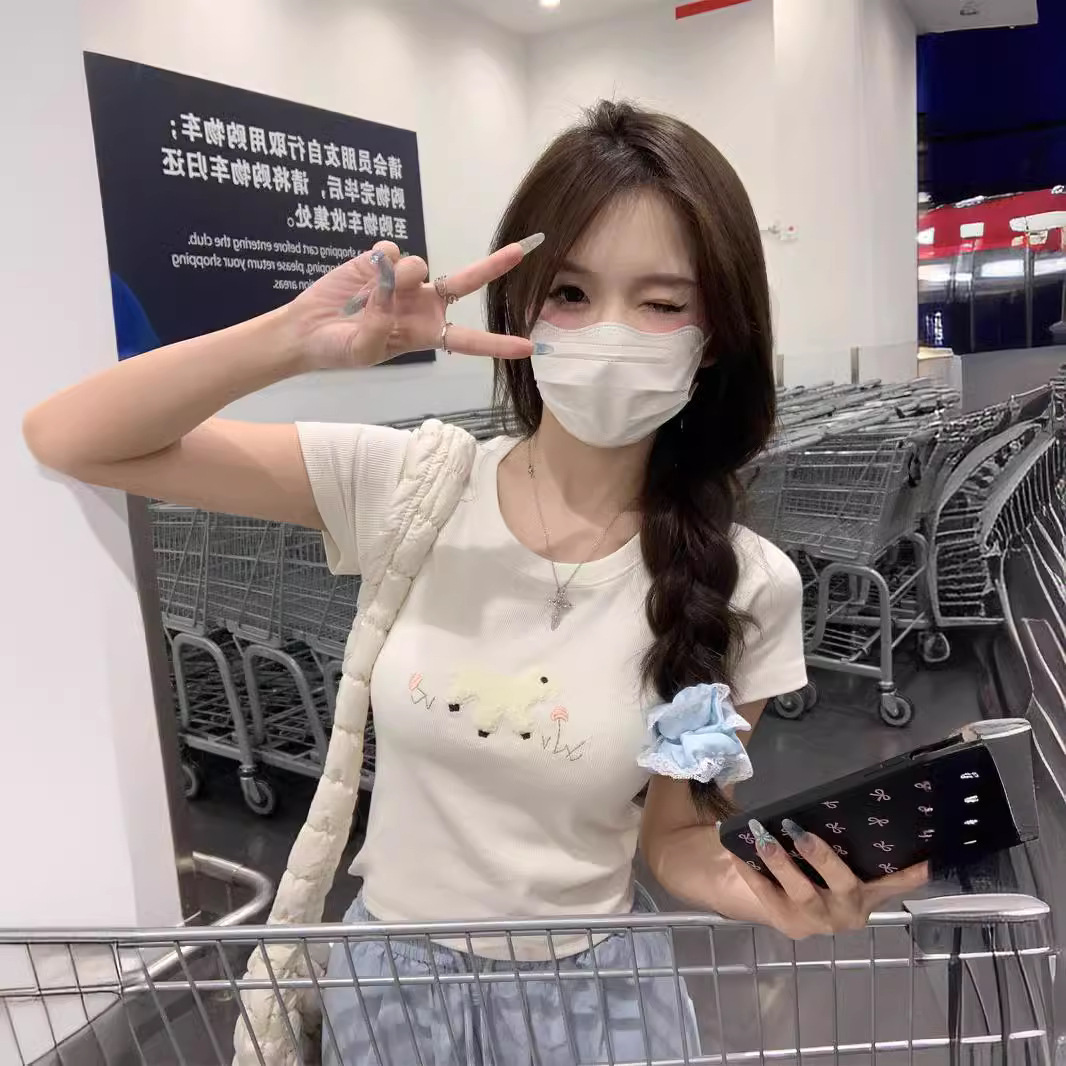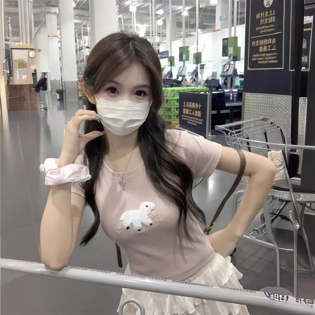 卡通毛巾绣短袖女韩版减龄T恤夏季纯欲修身显瘦短款粉色上衣