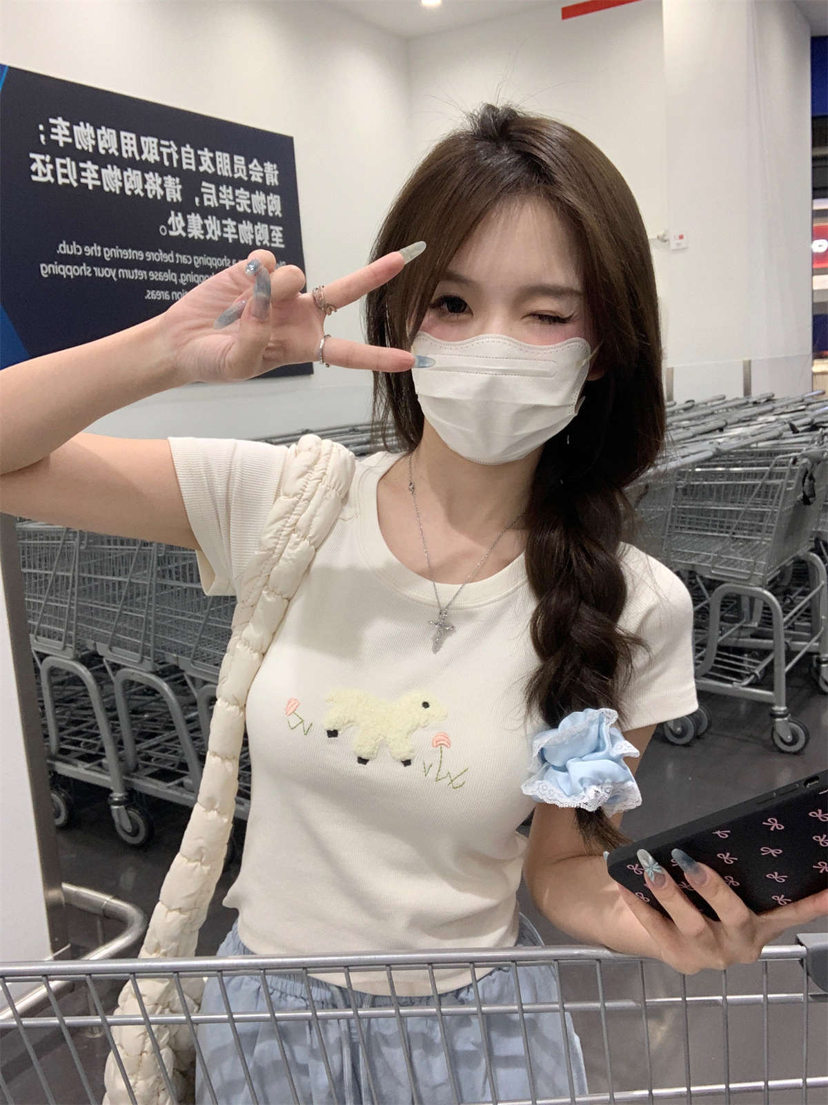 2025夏季新款蓝色纯棉短袖t恤女宽松百搭休闲卡通印花减龄上衣潮