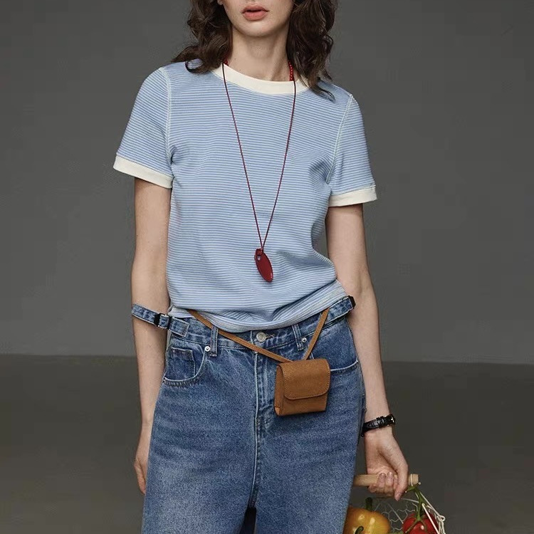 蓝色圆领细条纹撞色T恤女夏季新款撞色显白短袖复古上衣