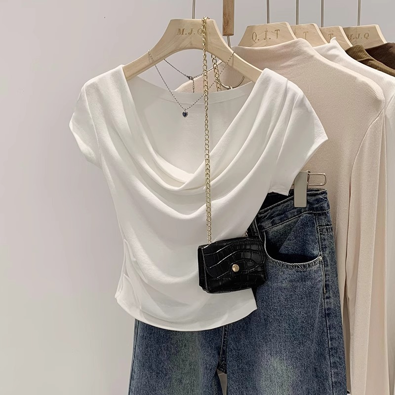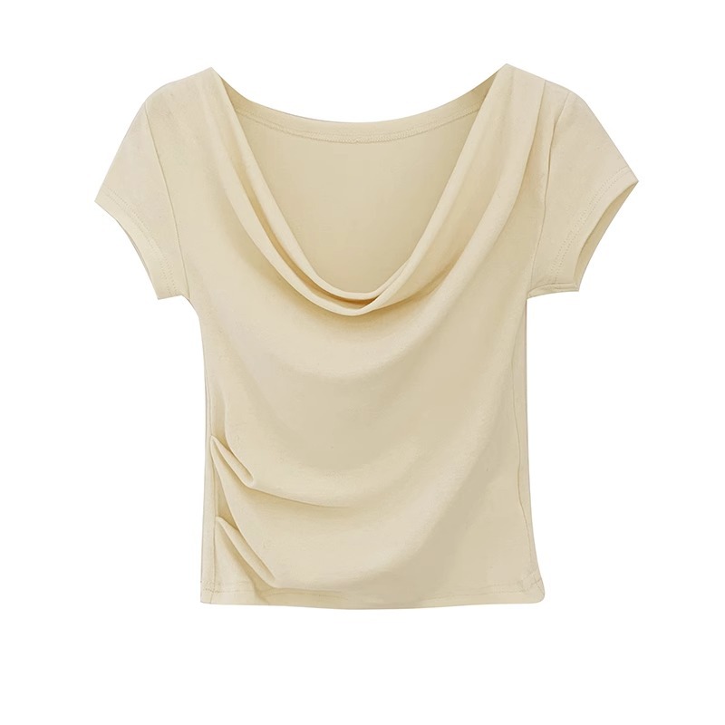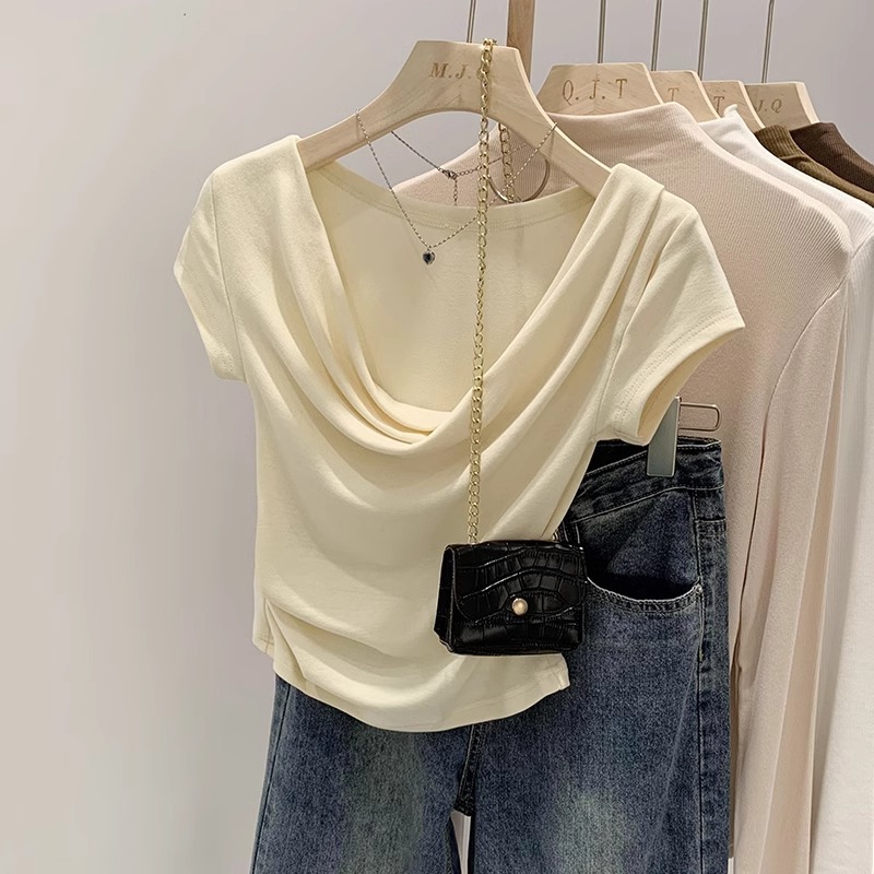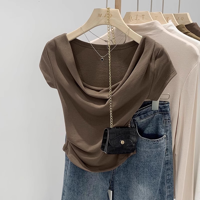 美式辣妹一字肩荡领T恤女夏季小众设计感短上衣粉色短袖