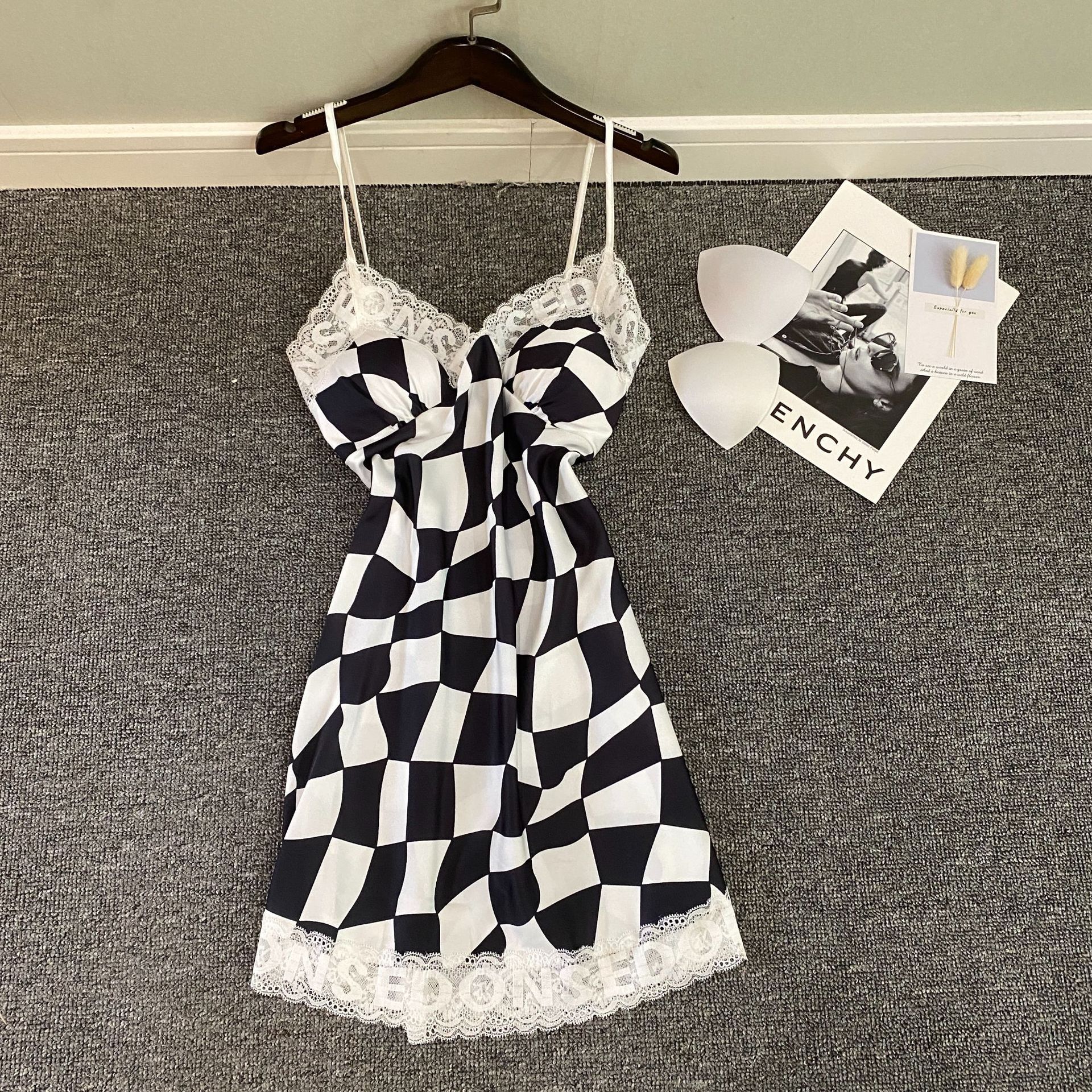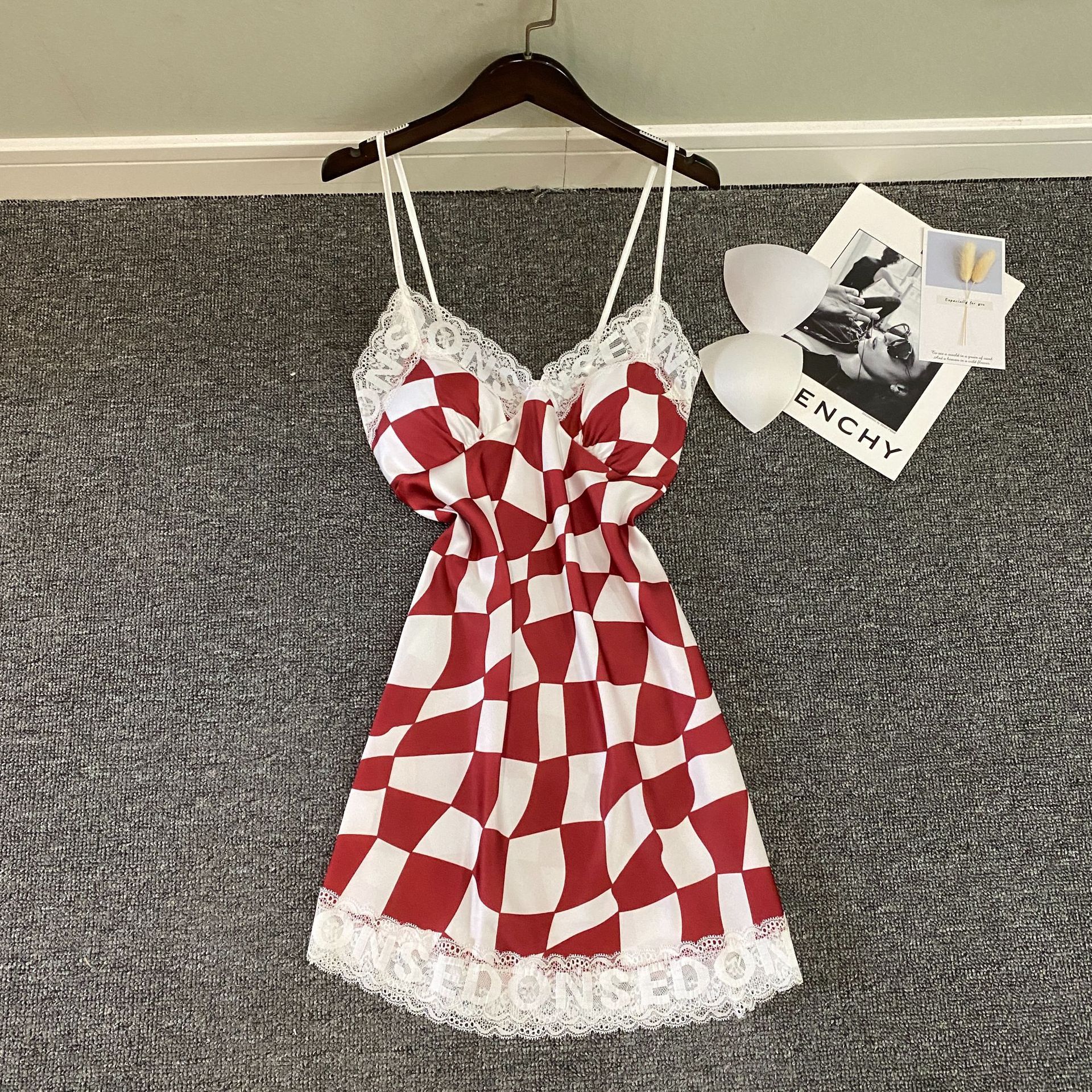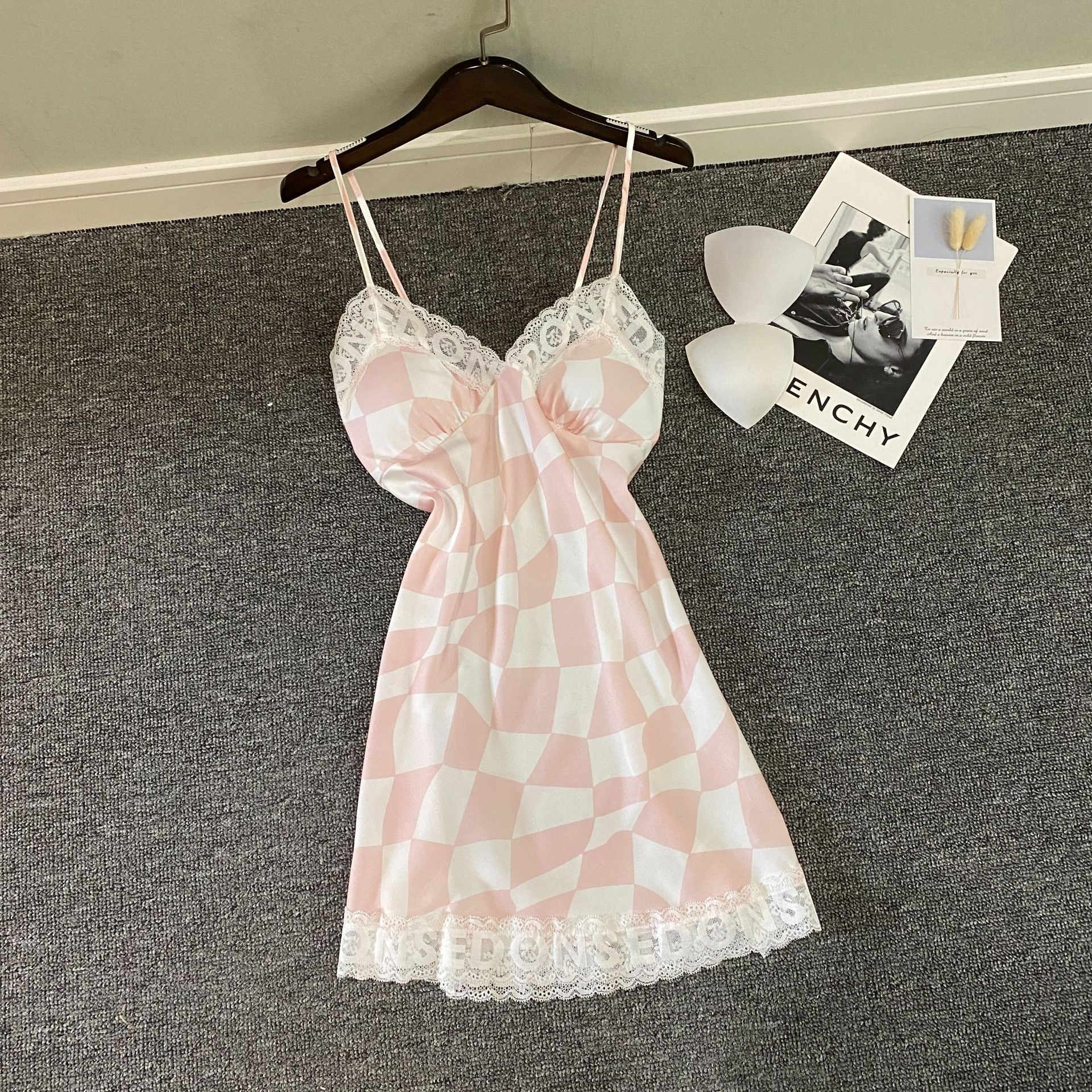 性感睡裙女士夏季吊带冰丝绸睡衣印花纯欲睡衣带胸垫家居服冰丝