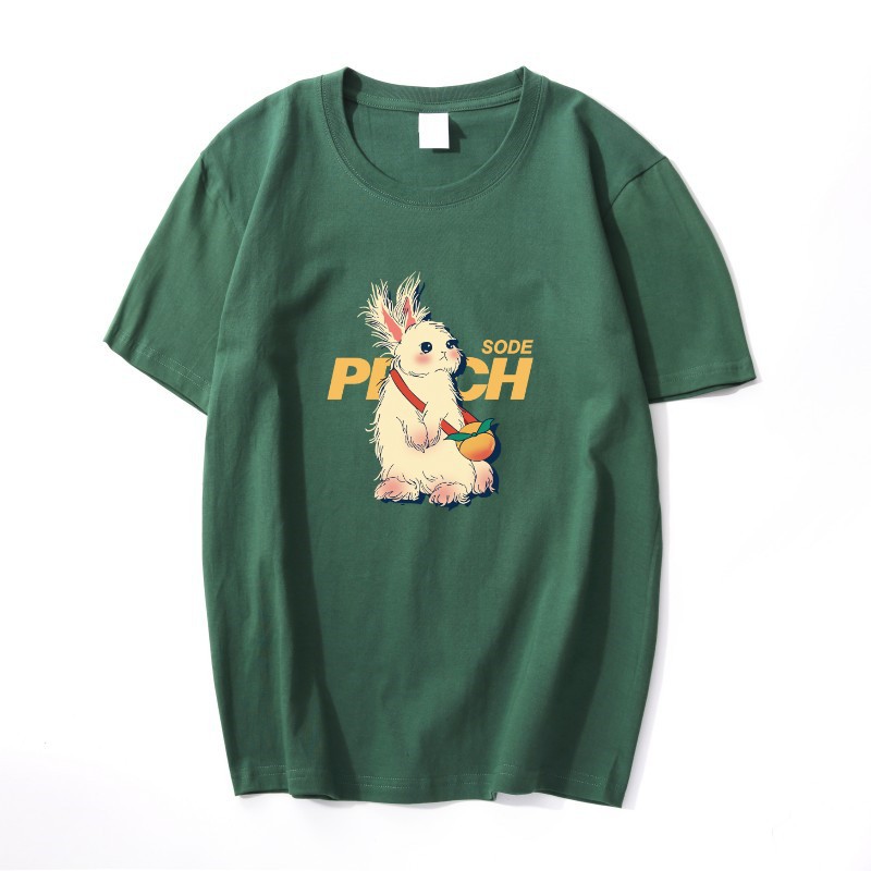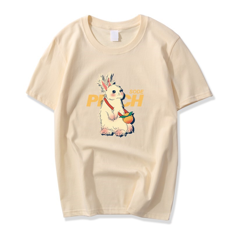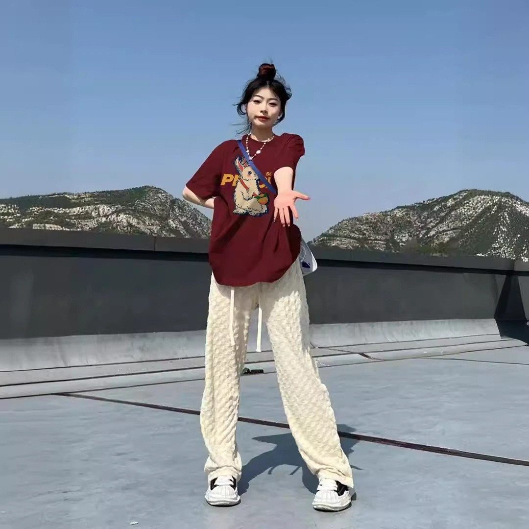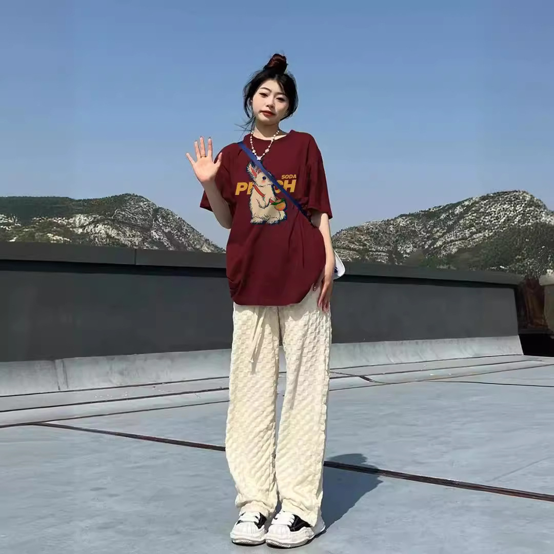 酒红色纯棉t恤女夏季复古兔子印花宽松大码正肩短袖上衣