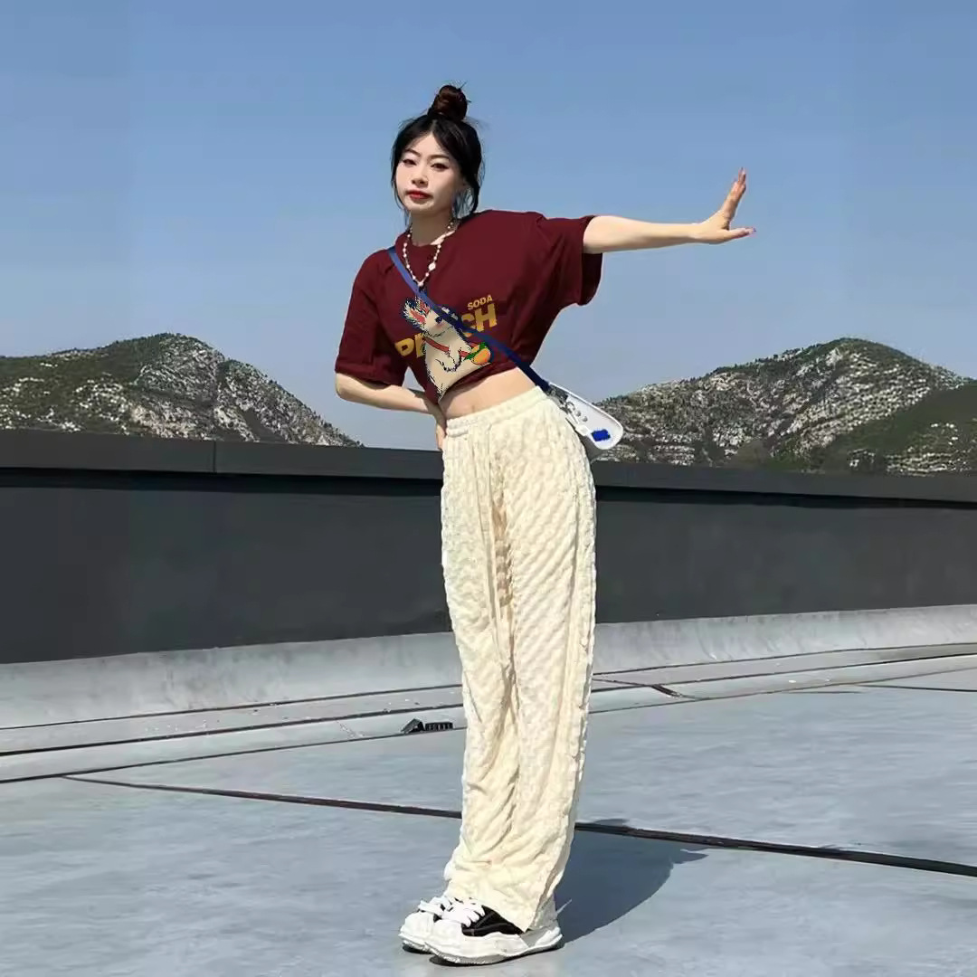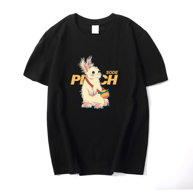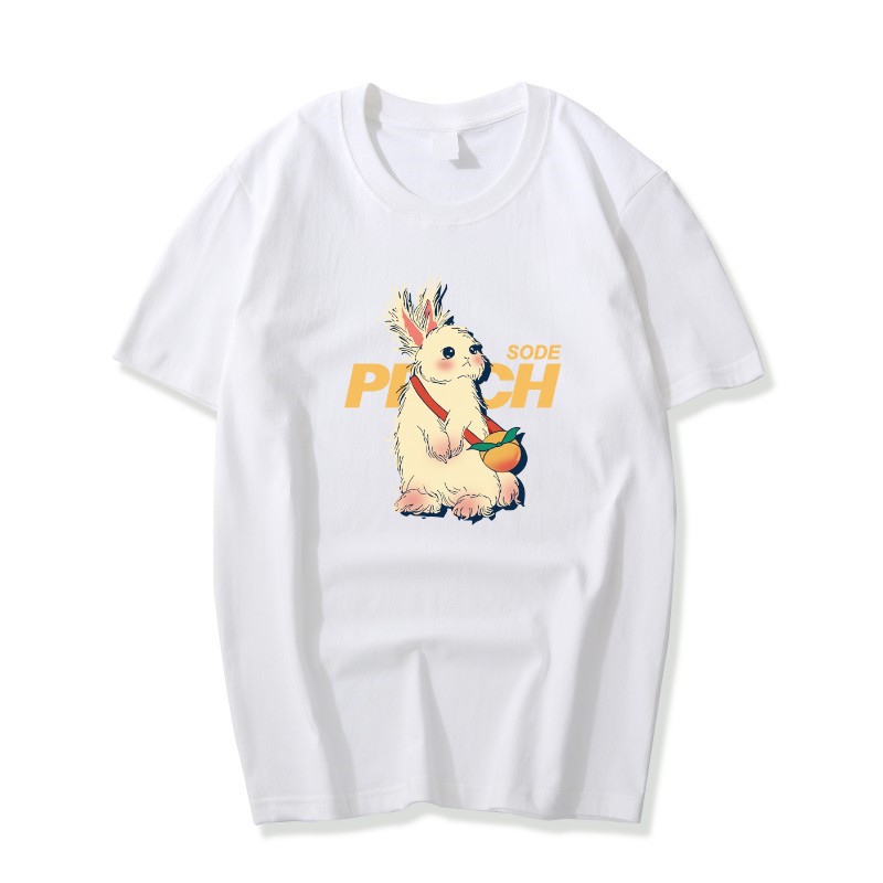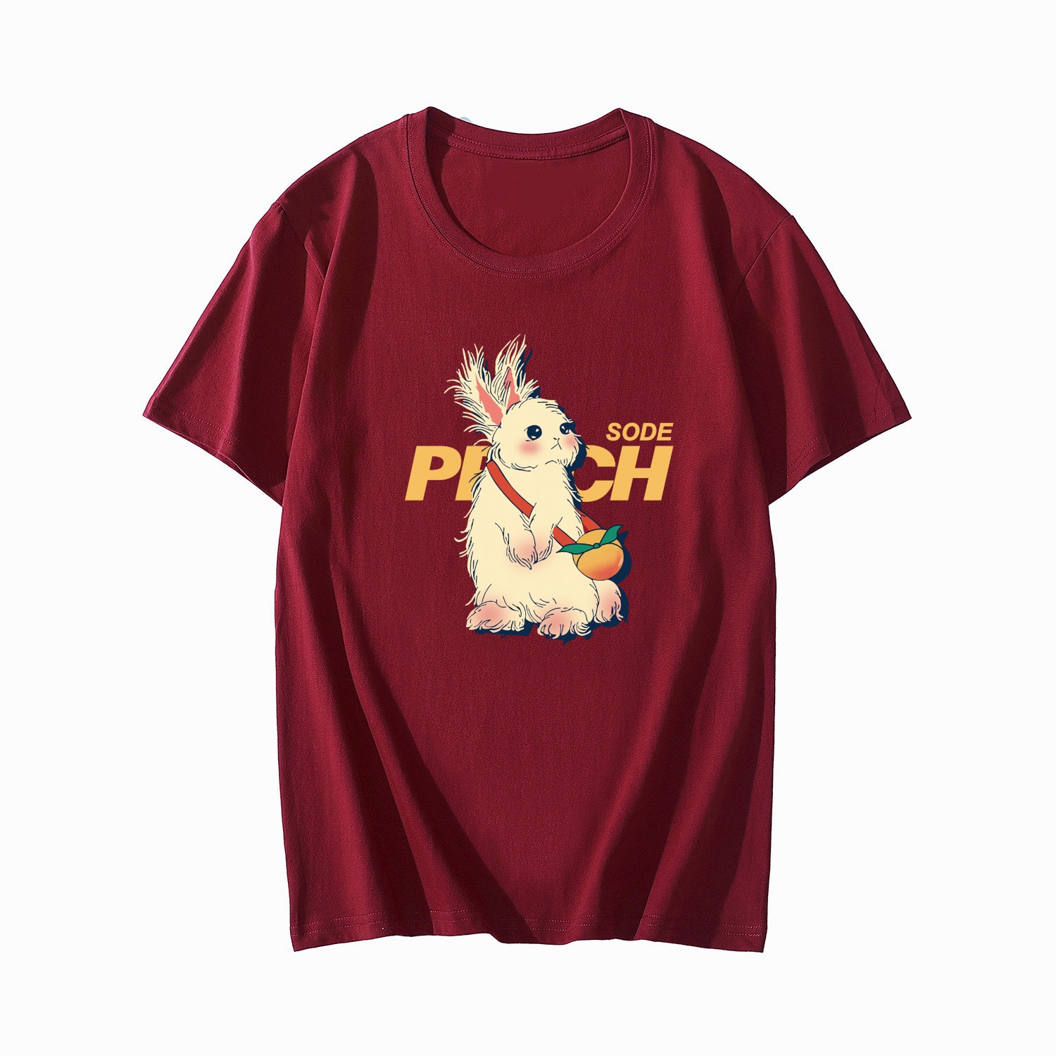 酒红色纯棉t恤女夏季复古兔子印花宽松大码正肩短袖上衣