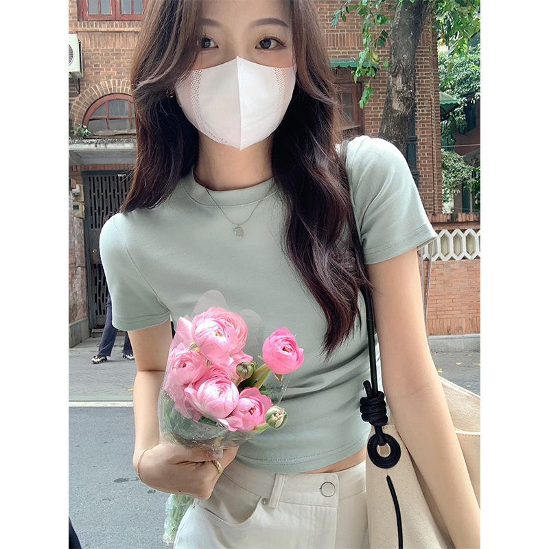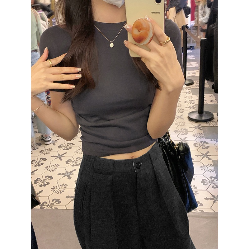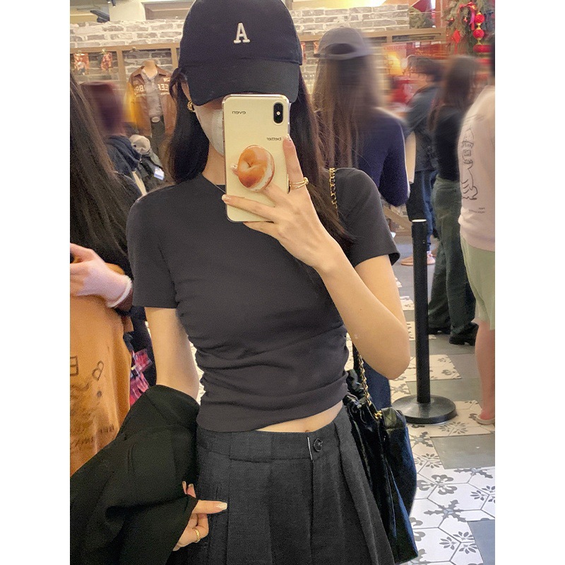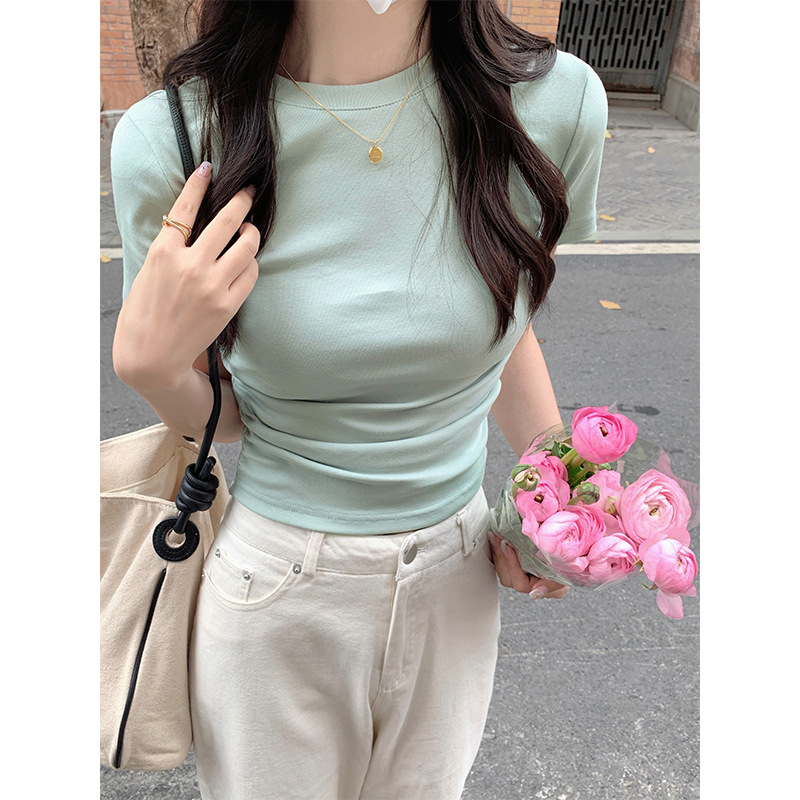 奶蓝色收腰褶皱T恤女夏季正肩短袖小个子甜辣露脐短上衣