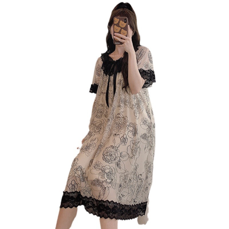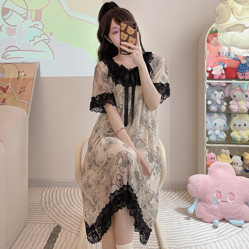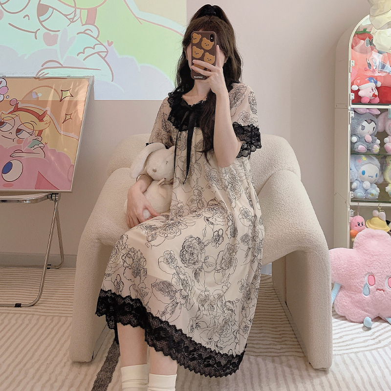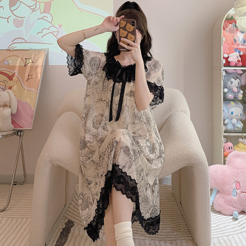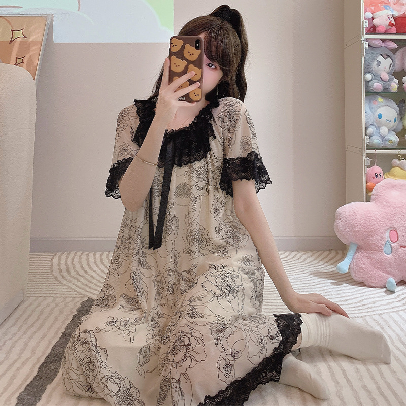 人气复古宫廷风睡裙女夏季网纱带胸垫长裙睡衣韩版公主风短袖睡裙