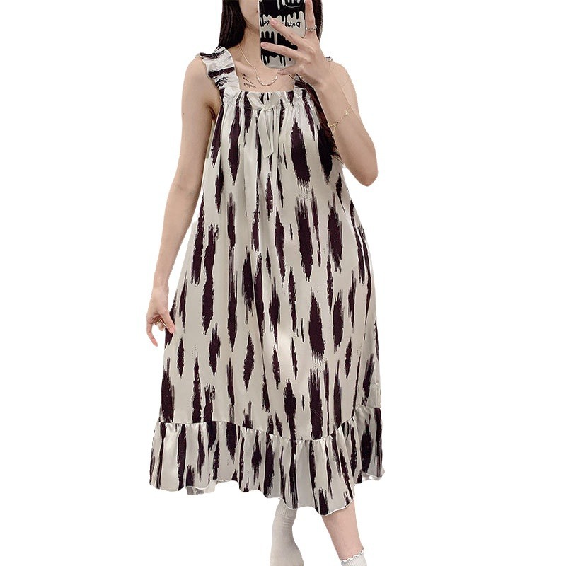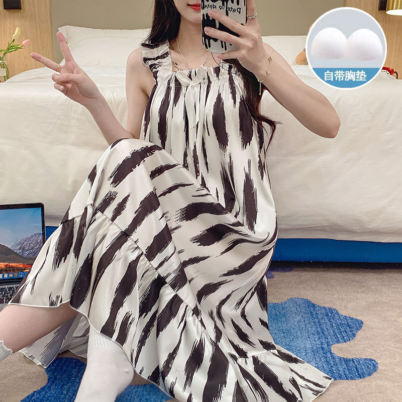 韩版ims条纹睡裙女夏季简约宽松吊带裙睡衣新款冰丝带胸垫睡裙女