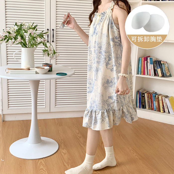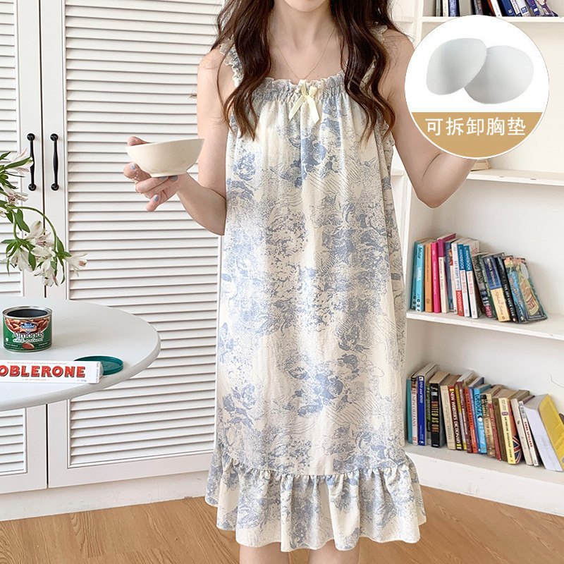 新款水墨画睡裙女夏季甜美学生睡衣中长裙韩版ims带胸垫睡裙夏天
