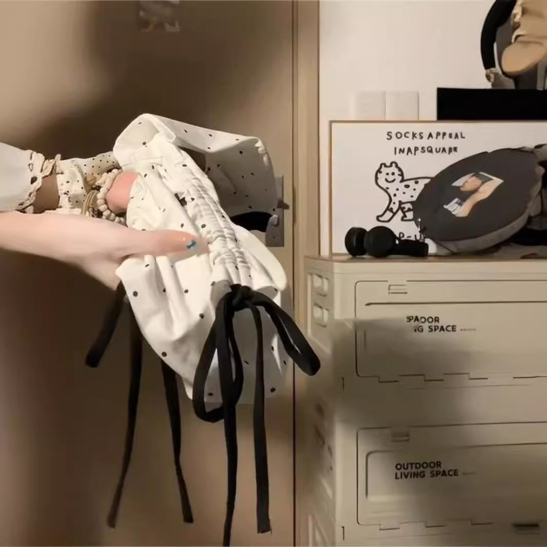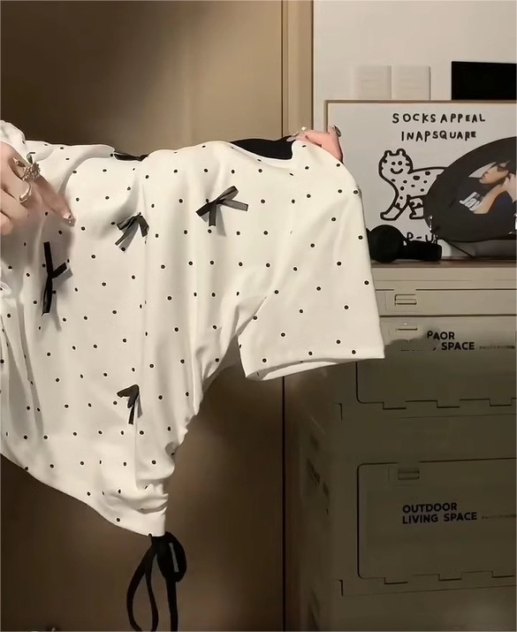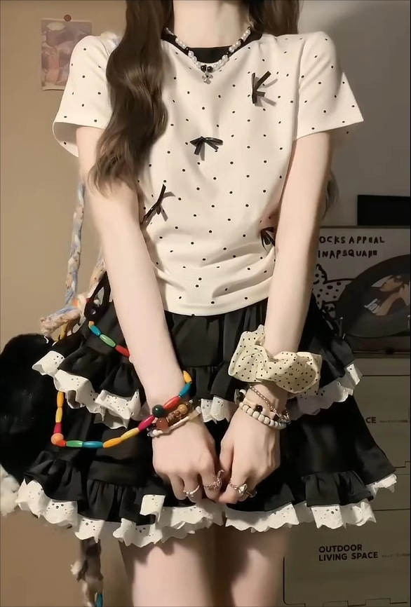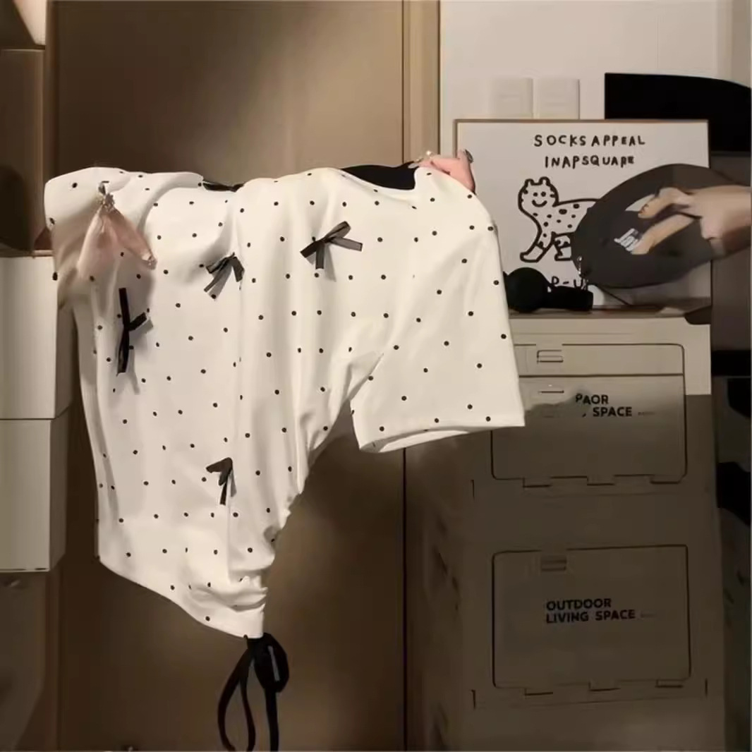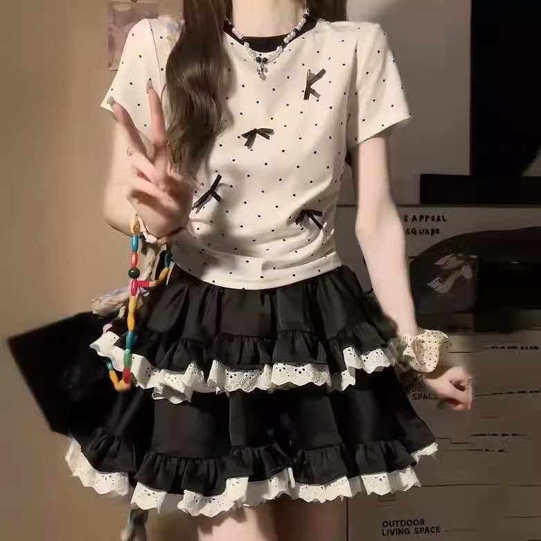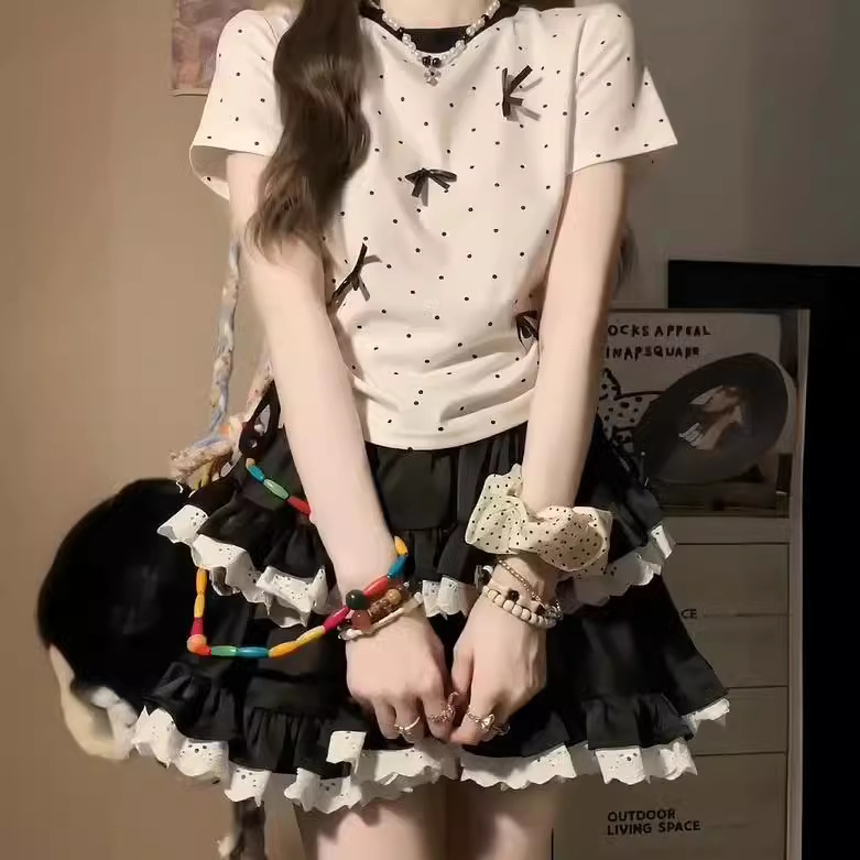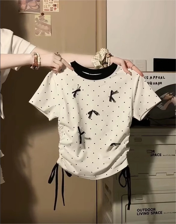 芭蕾风波点抽绳收腰短袖t恤女夏设计感短款修身甜辣别致正肩上衣
