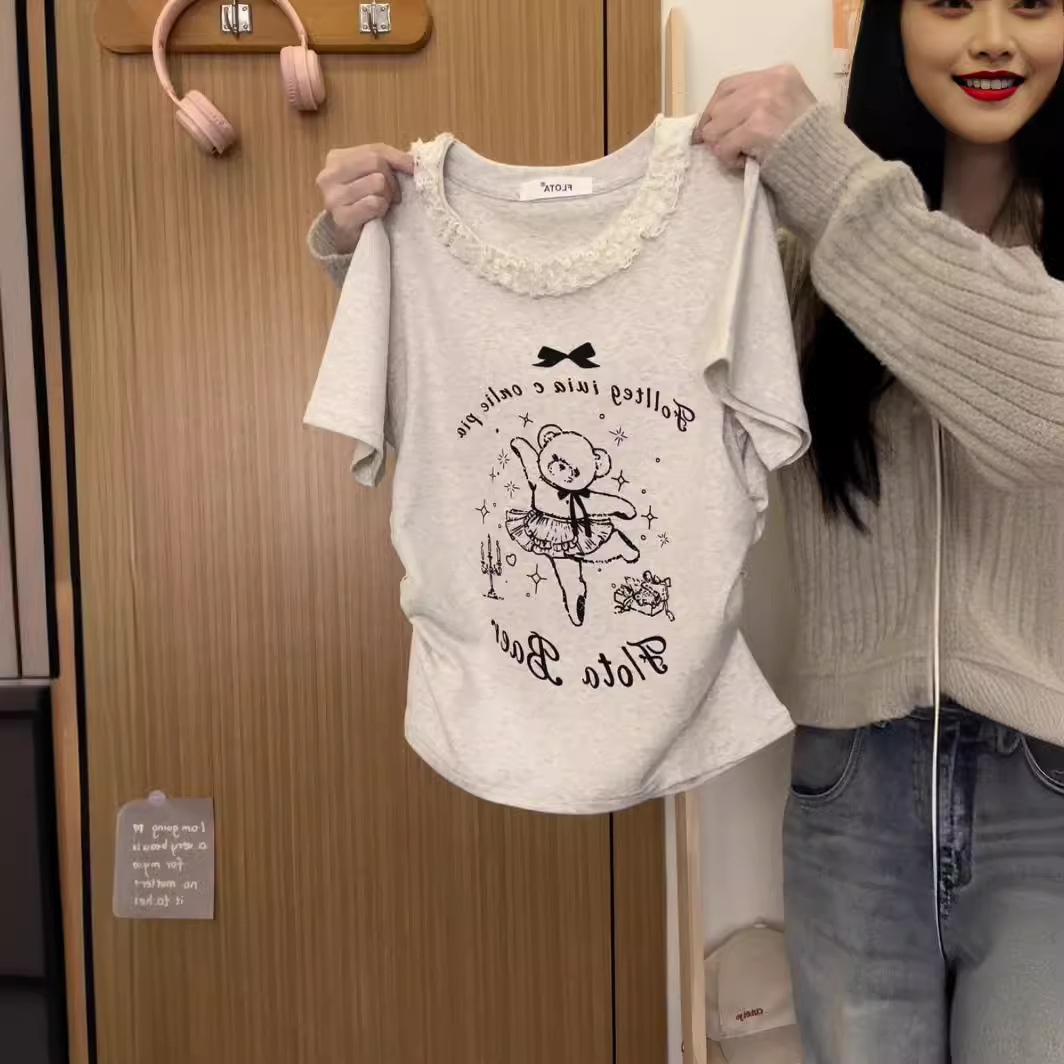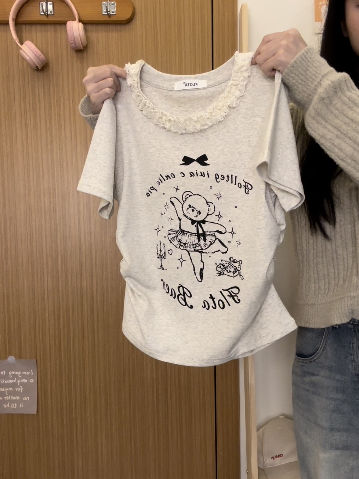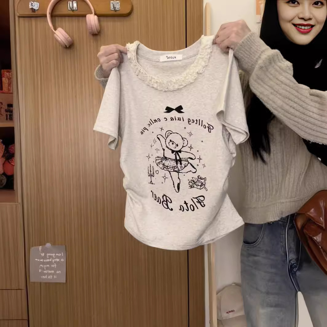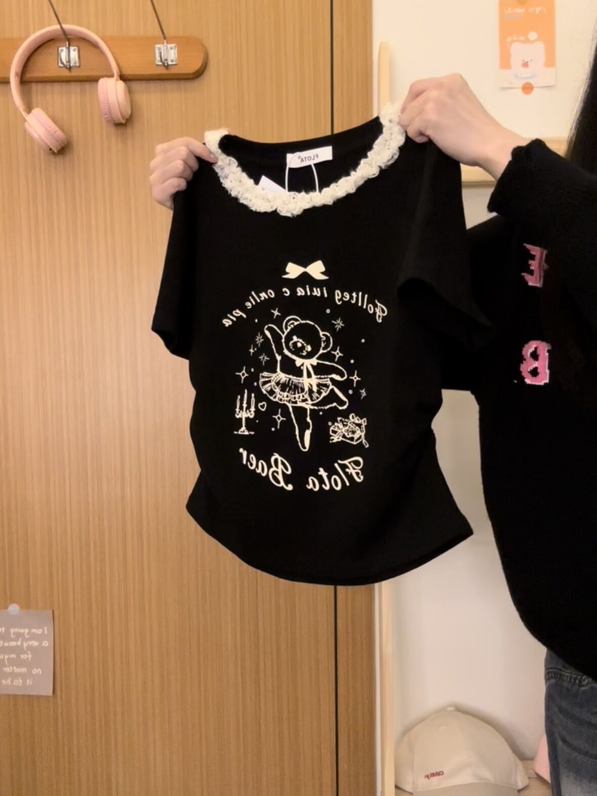 芭蕾小熊蕾丝正肩短款短袖T恤女修身ins上衣夏季新款