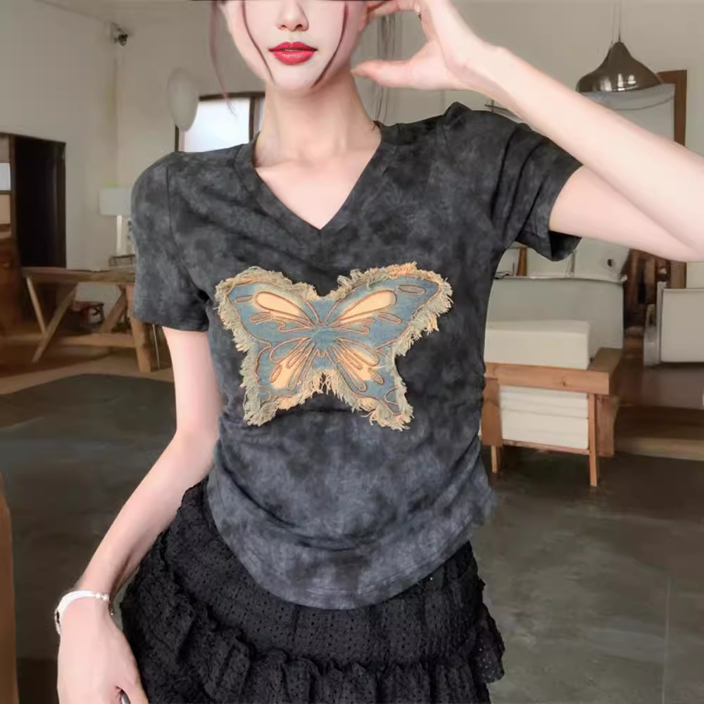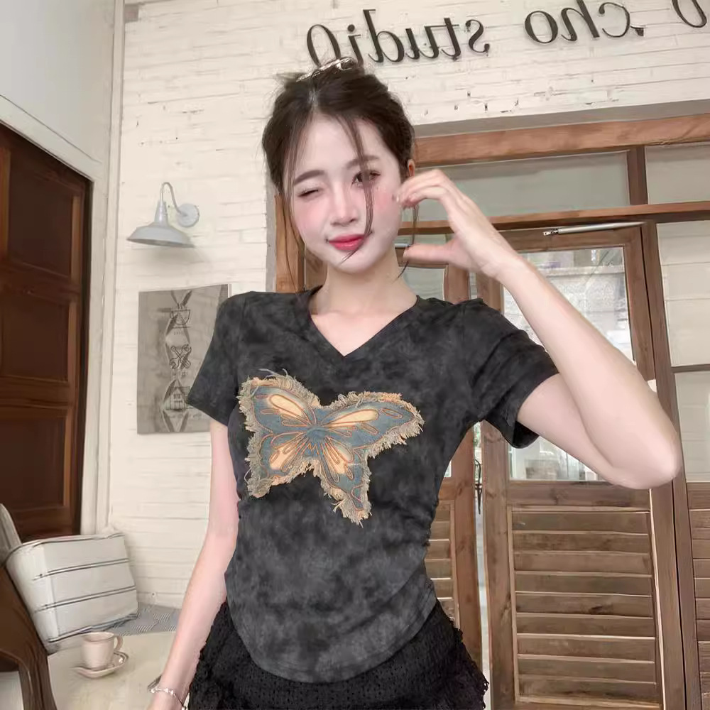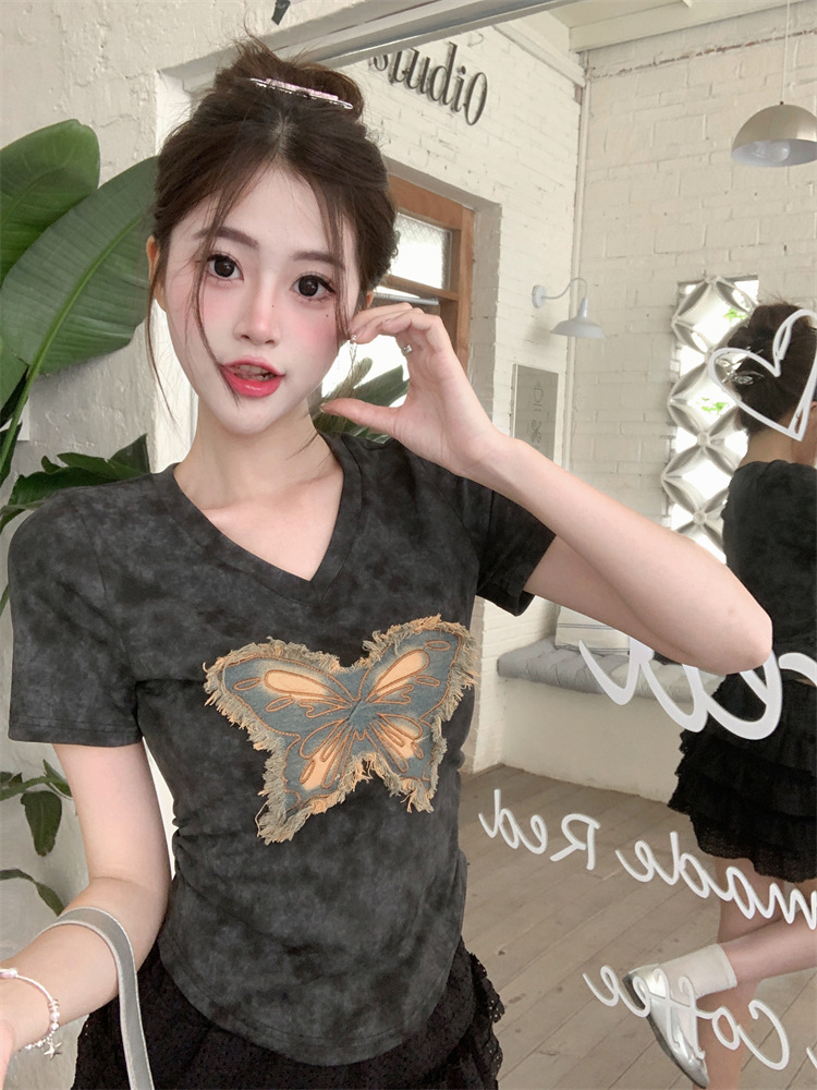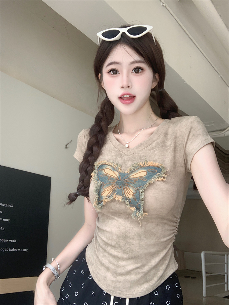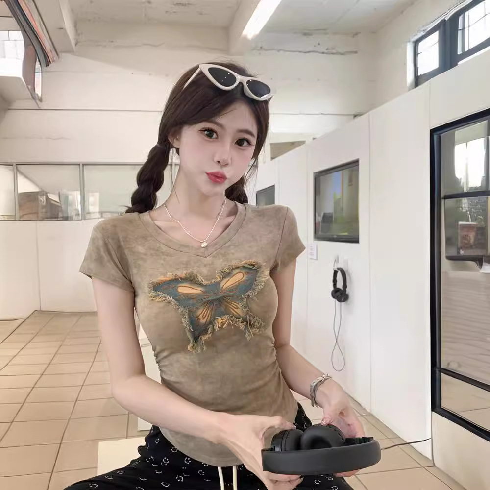 胖mm显瘦V领短袖t恤大码女装夏季辣妹美式小衫设计感正肩体恤上衣