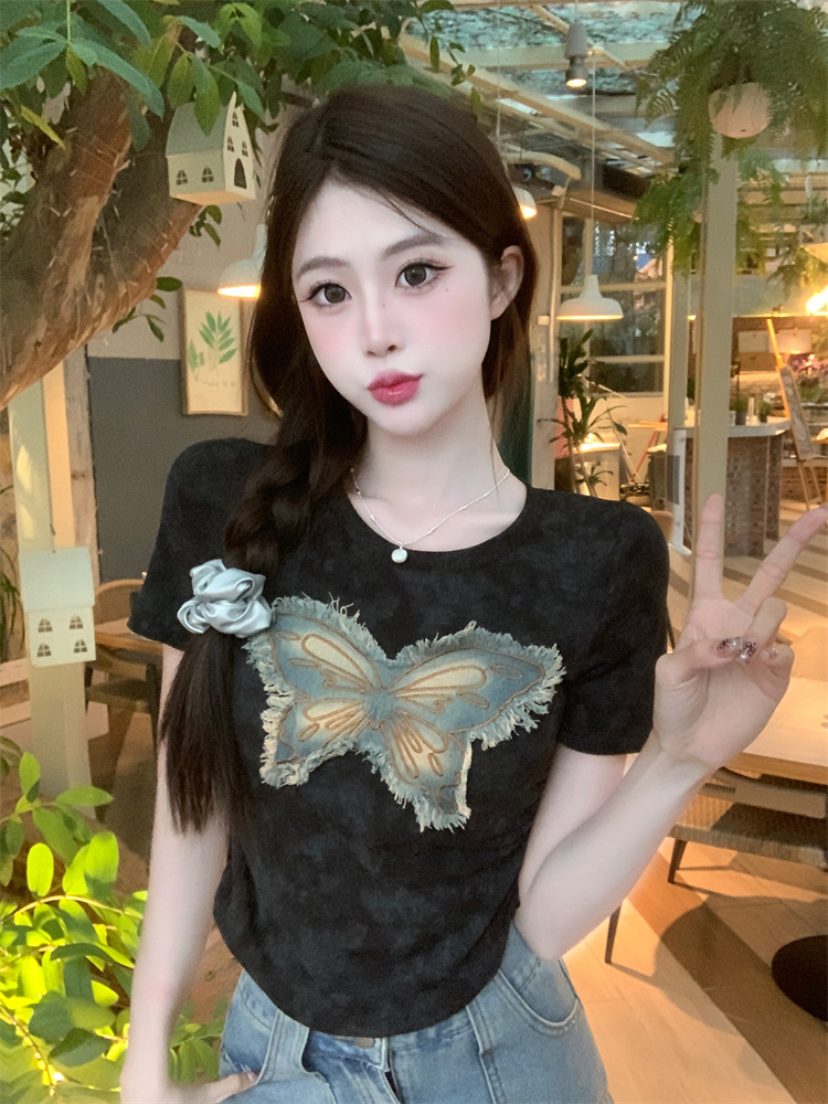 蕾丝拼接方领T恤女夏季蝴蝶结修身纯欲风正肩短袖小众短上衣