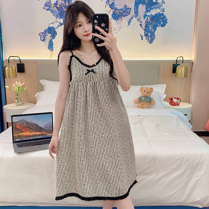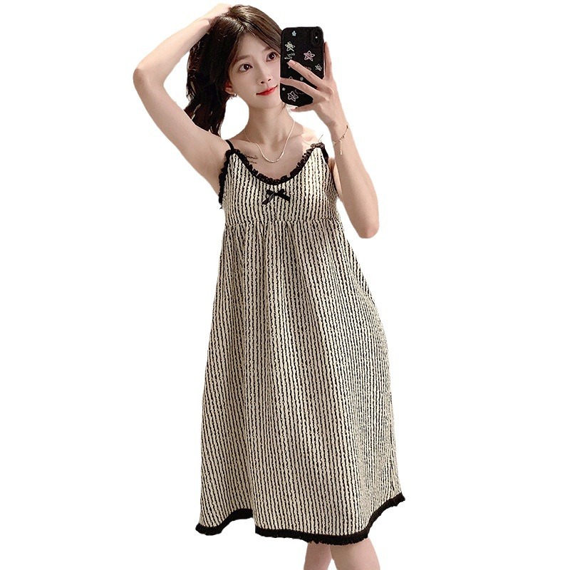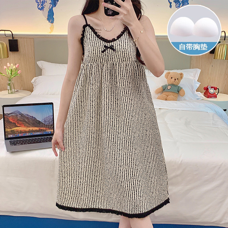 新款甜美条纹睡裙女薄款花边带胸垫睡衣吊带裙夏季韩版ims睡裙
