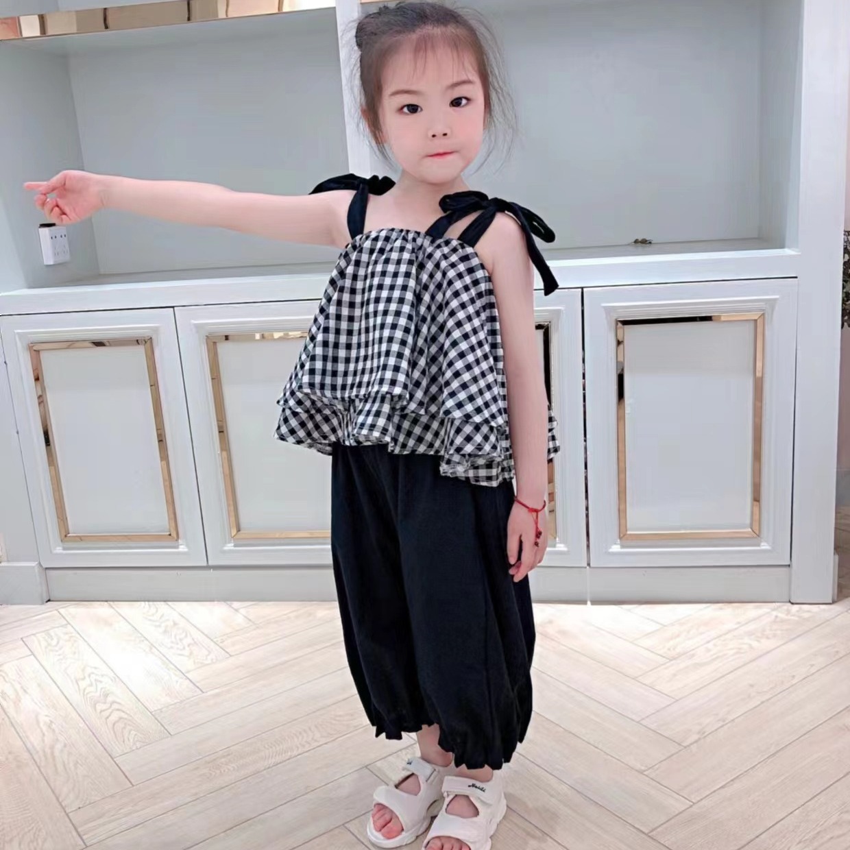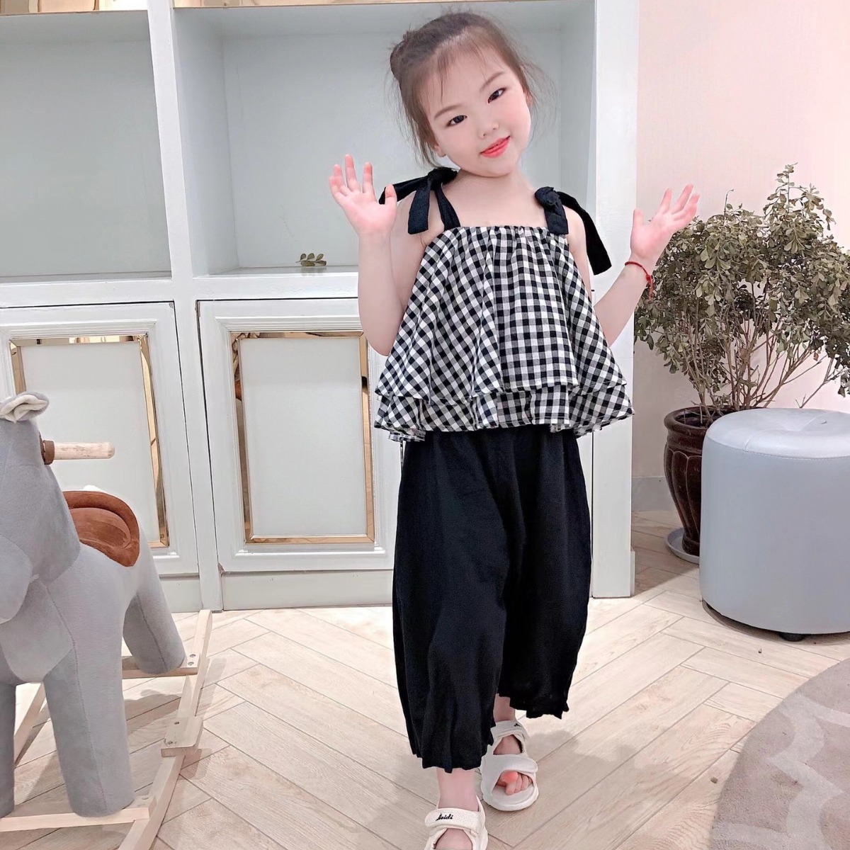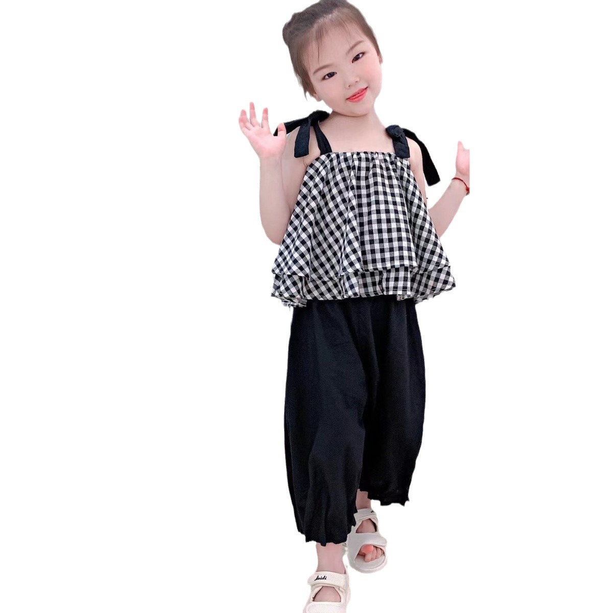夏季女童套装宝宝网红洋气儿童个性潮牌韩版格子吊带衫百褶阔腿裤