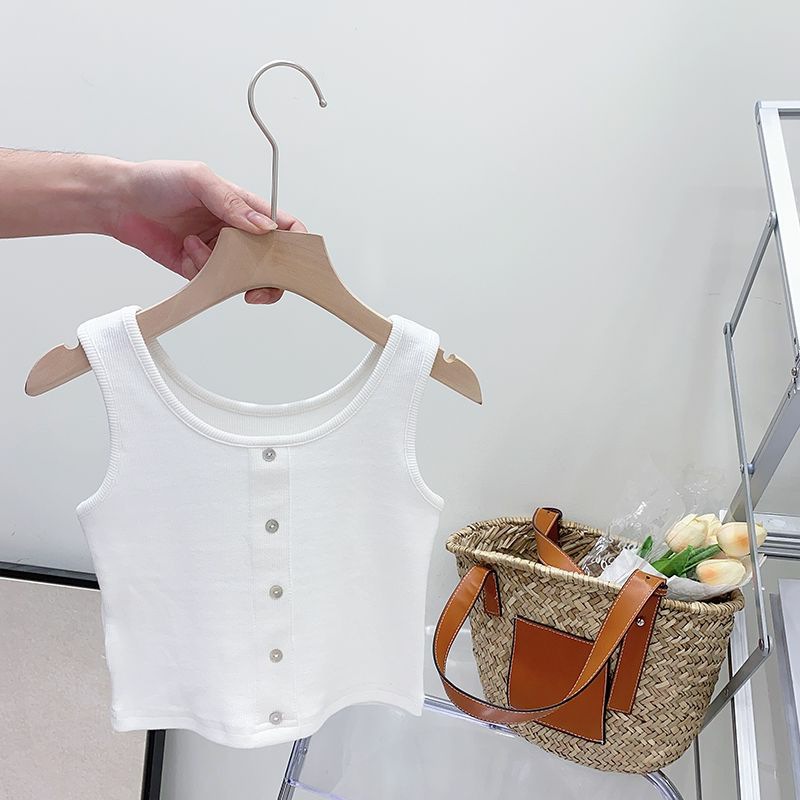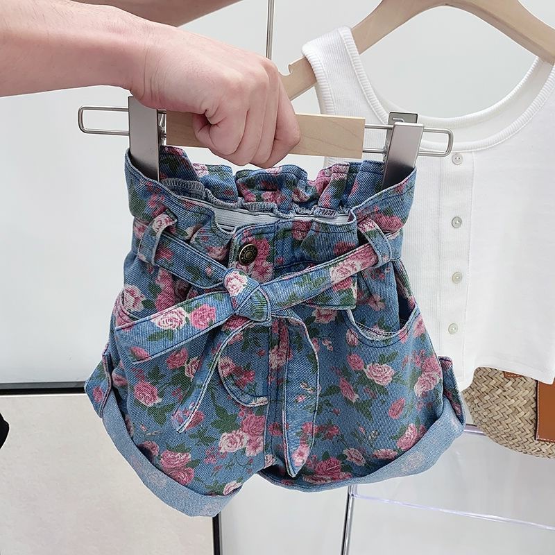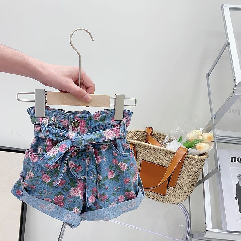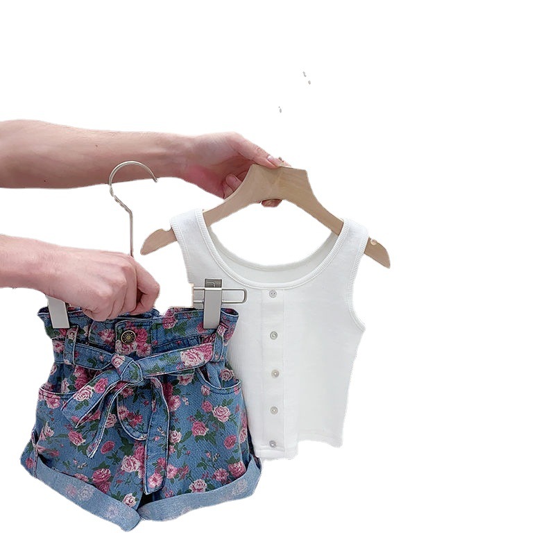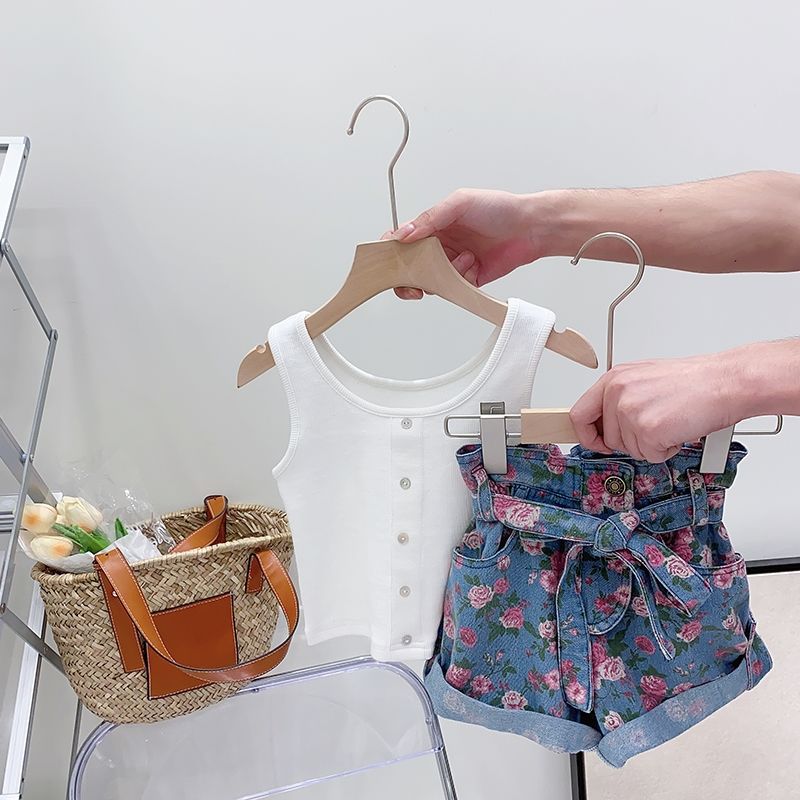 女童夏季套装宝宝洋气儿童个性潮牌韩版背心花朵高腰牛仔短裤热裤