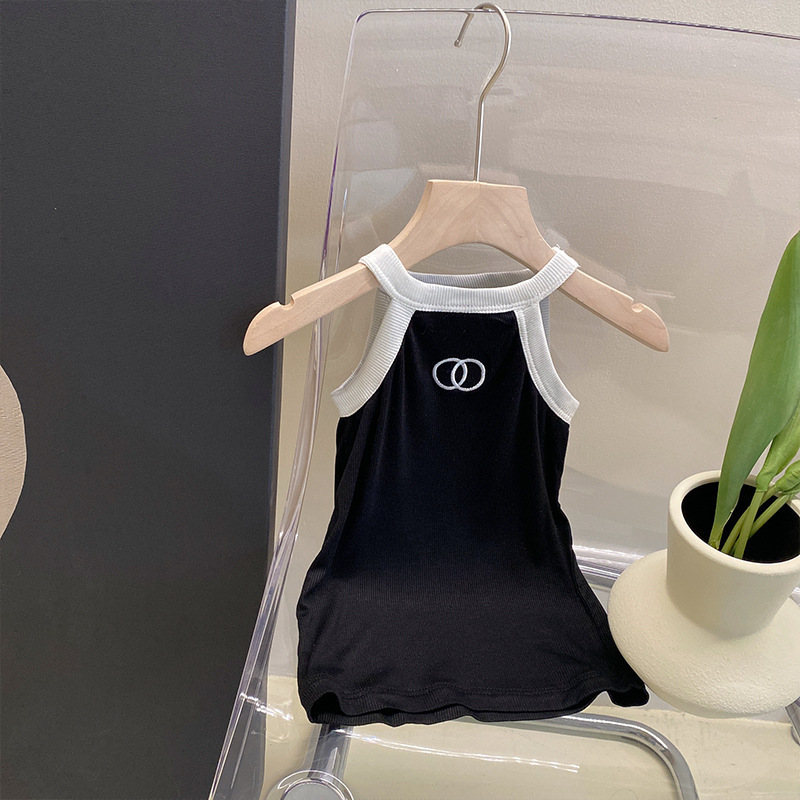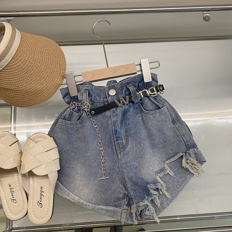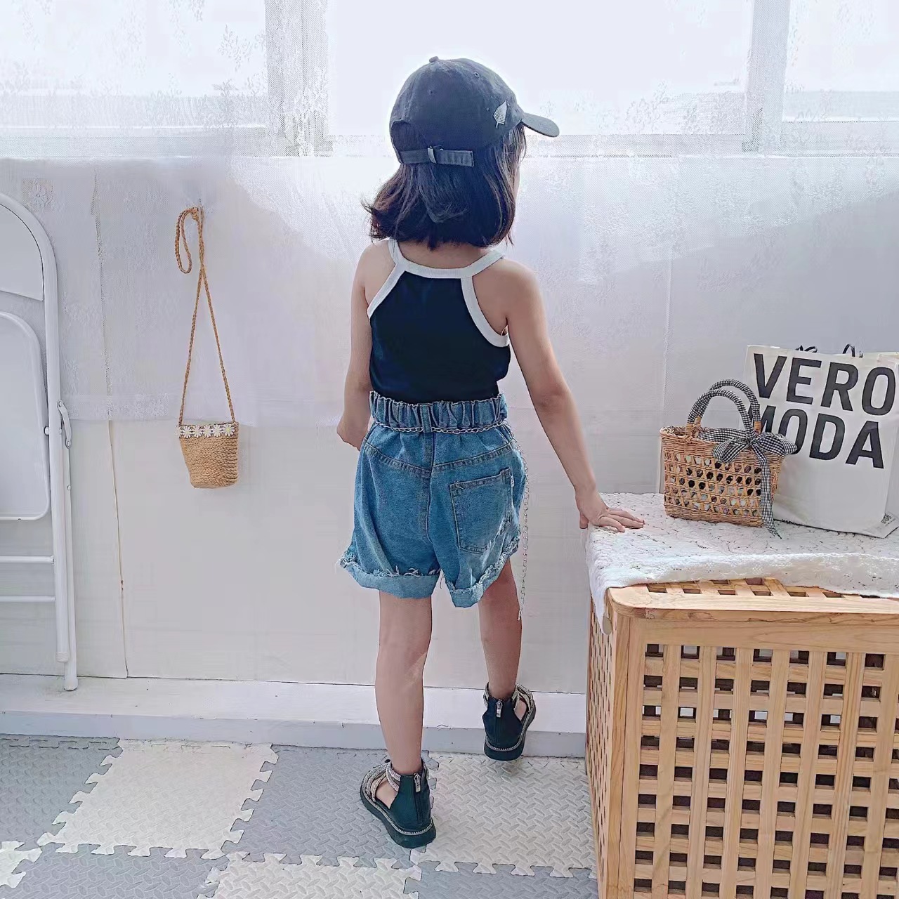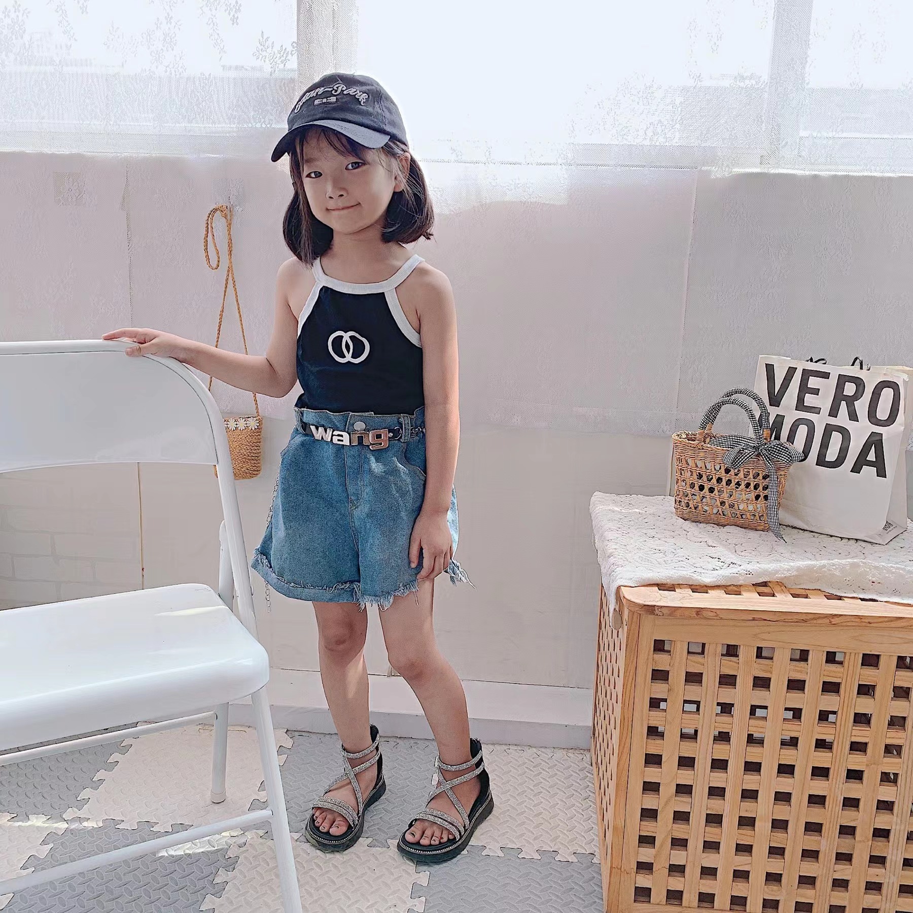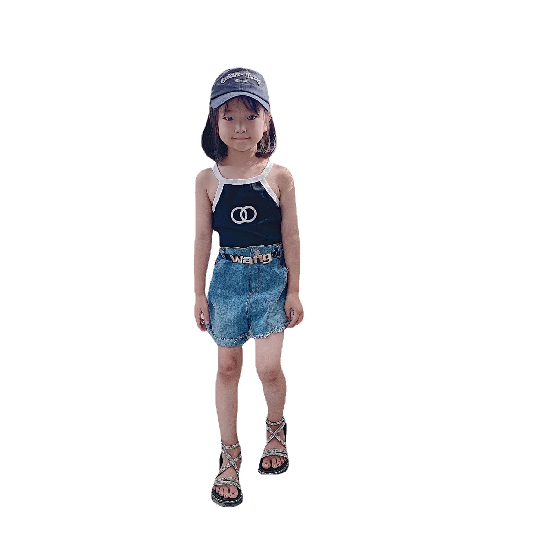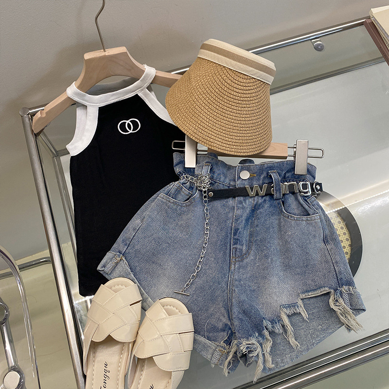 夏季女童套装宝宝洋气儿童个性潮小香风拼色吊带背心破洞牛仔短裤