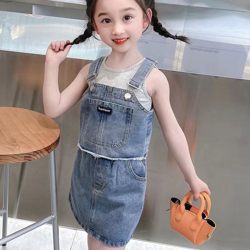 夏季女童套装宝宝洋气儿童个性潮韩版牛仔背心吊带短裙网红三件套