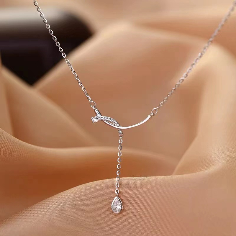 法式新款饰品笑脸镶钻锁骨链水滴流苏吊坠S925纯银项链女首饰