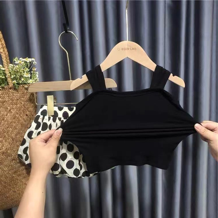 夏季女童套装宝宝洋气儿童个性潮牌韩版背心吊带格子波点花苞短裤