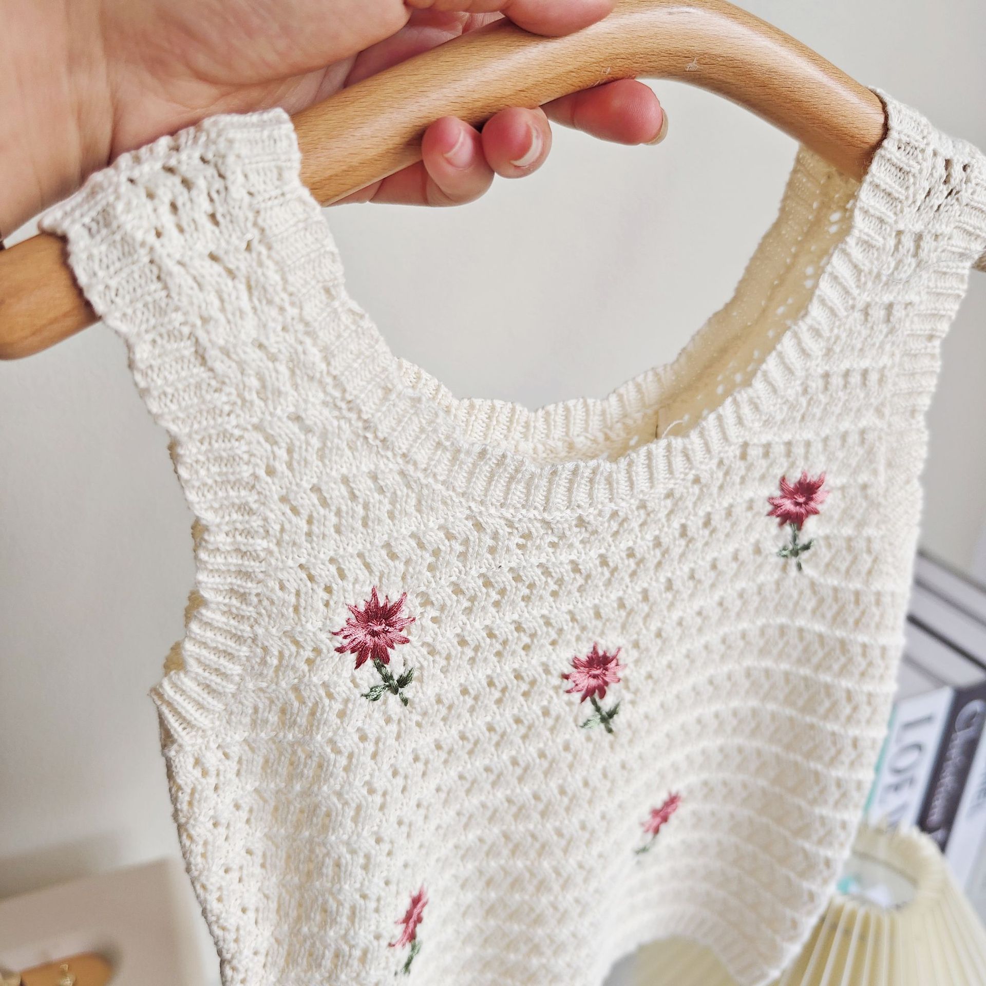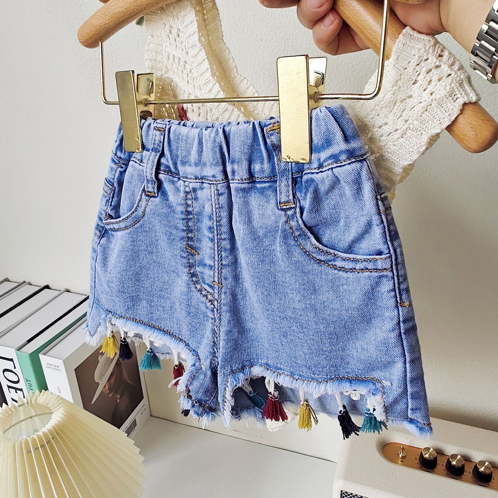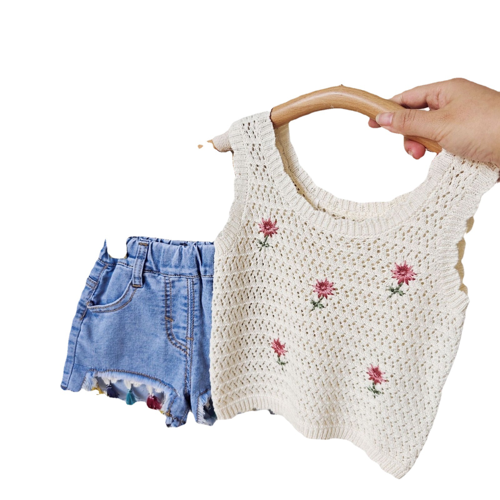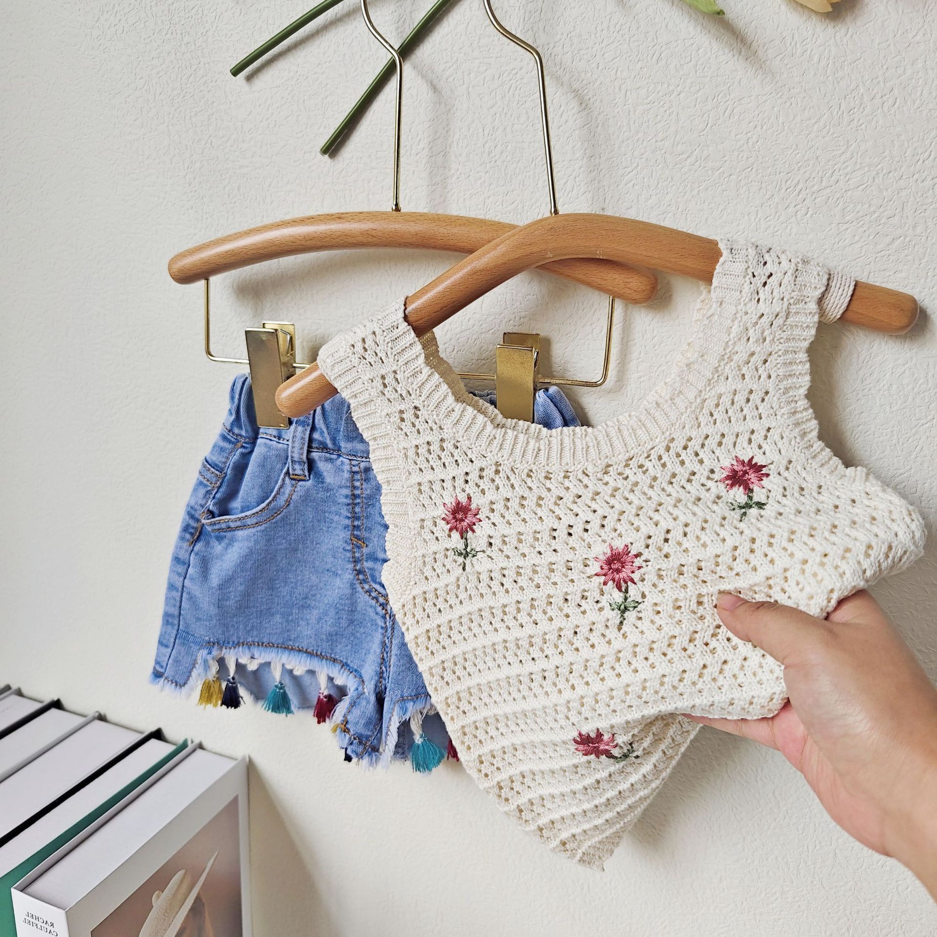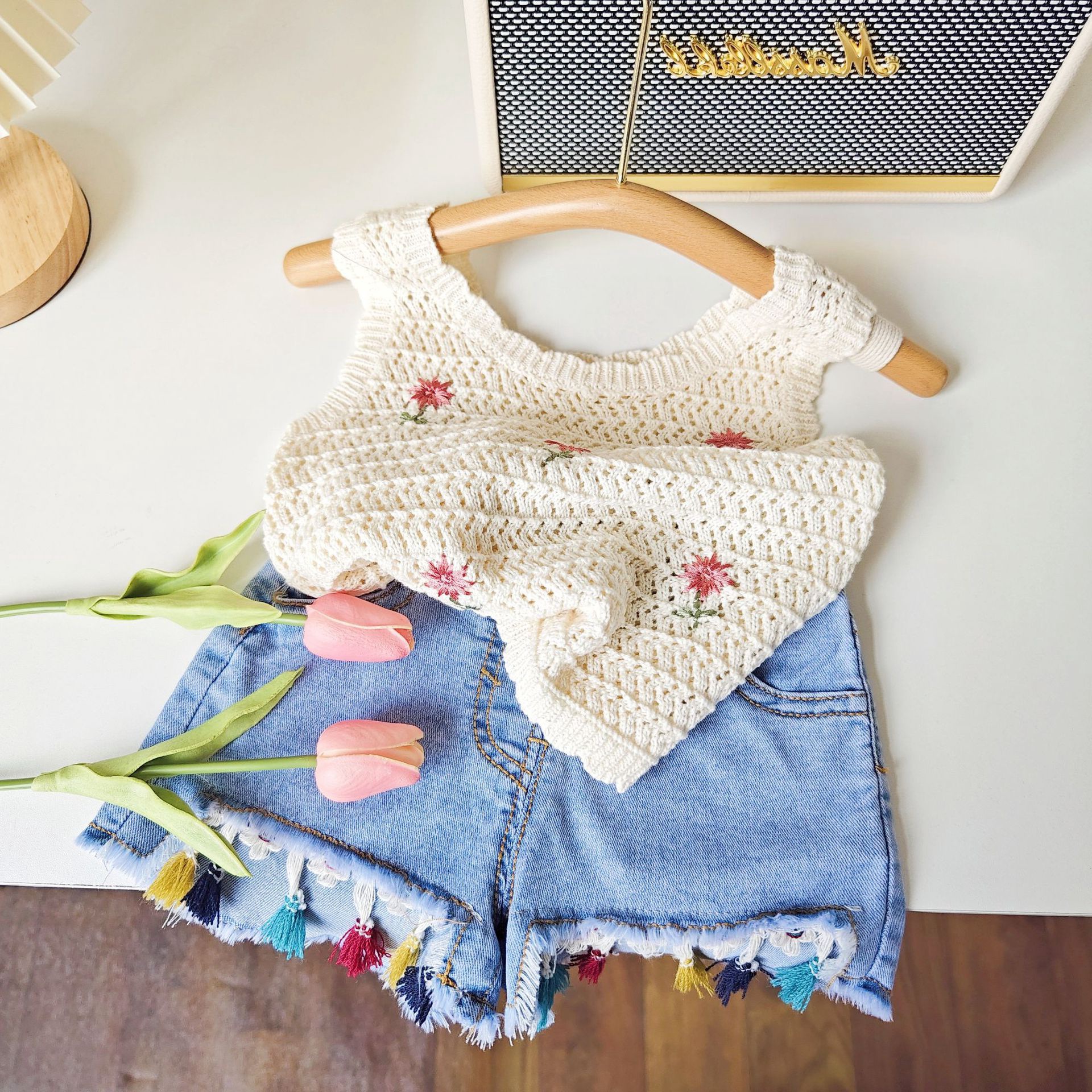 夏季女童套装宝宝洋气儿童个性潮牌花朵针织背心吊带流苏牛仔短裤