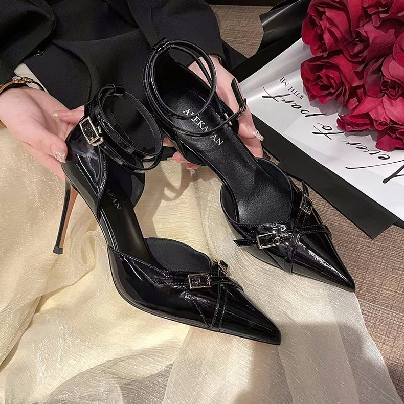 亮皮黑色性感时尚凉鞋女新款春夏款尖头细跟搭扣皮带扣高跟鞋