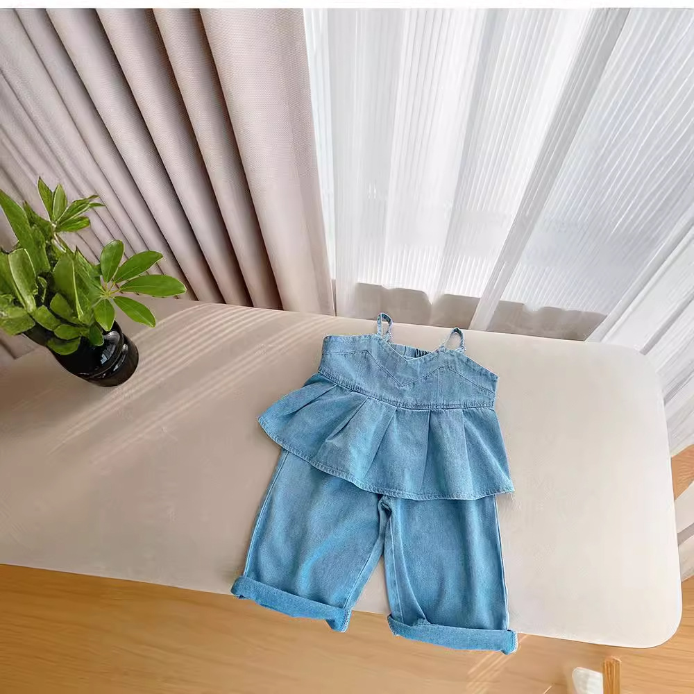 女童套装新款儿童洋气夏装新品韩系软牛仔小吊带直筒裤两件套