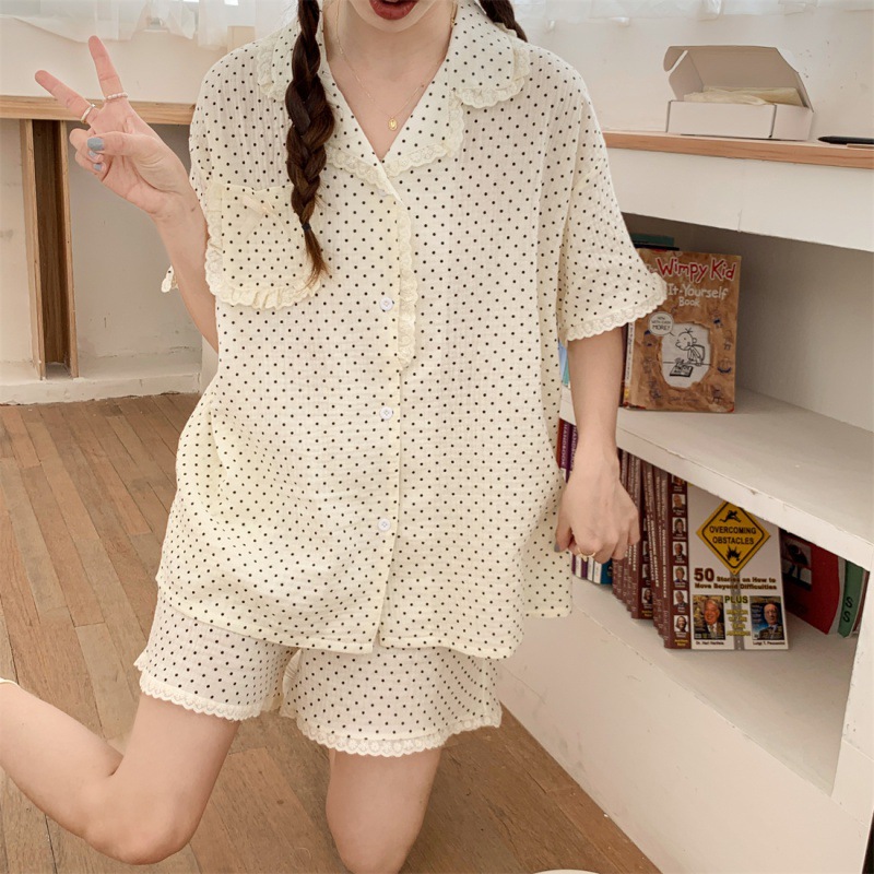 韩国chic女士夏季波点娃娃领甜美棉纱公主风短女睡衣套装家居服女
