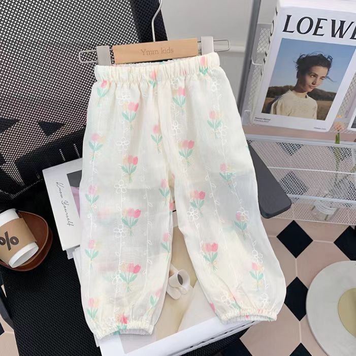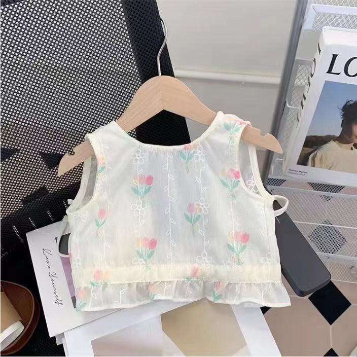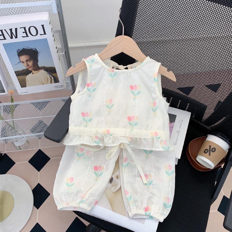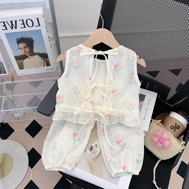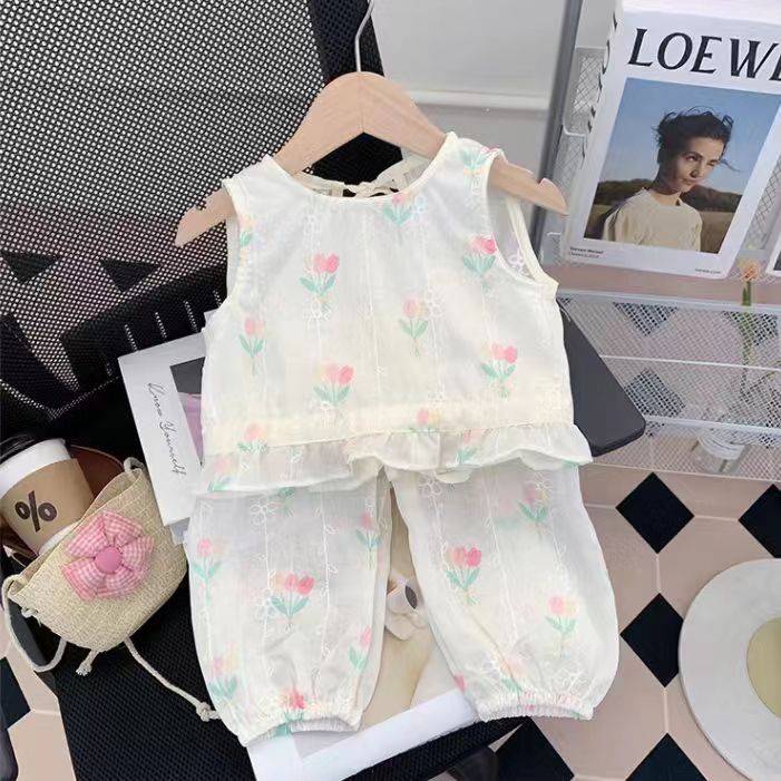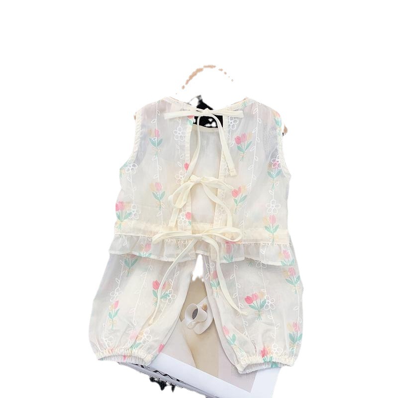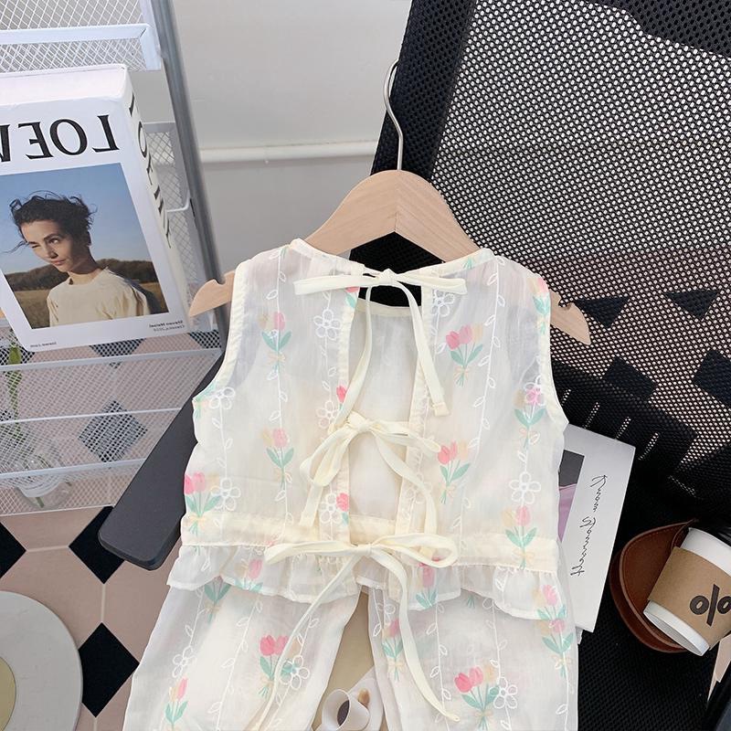 夏季女童套装宝宝洋气儿童个性潮牌韩版网红花朵背心雪纺衫防蚊裤
