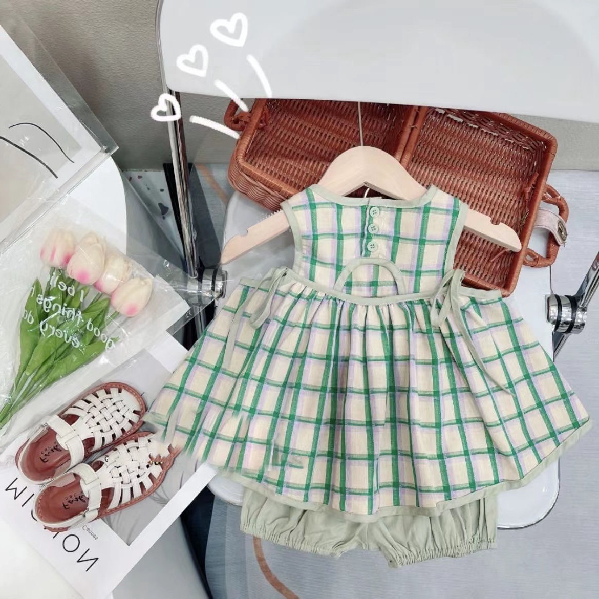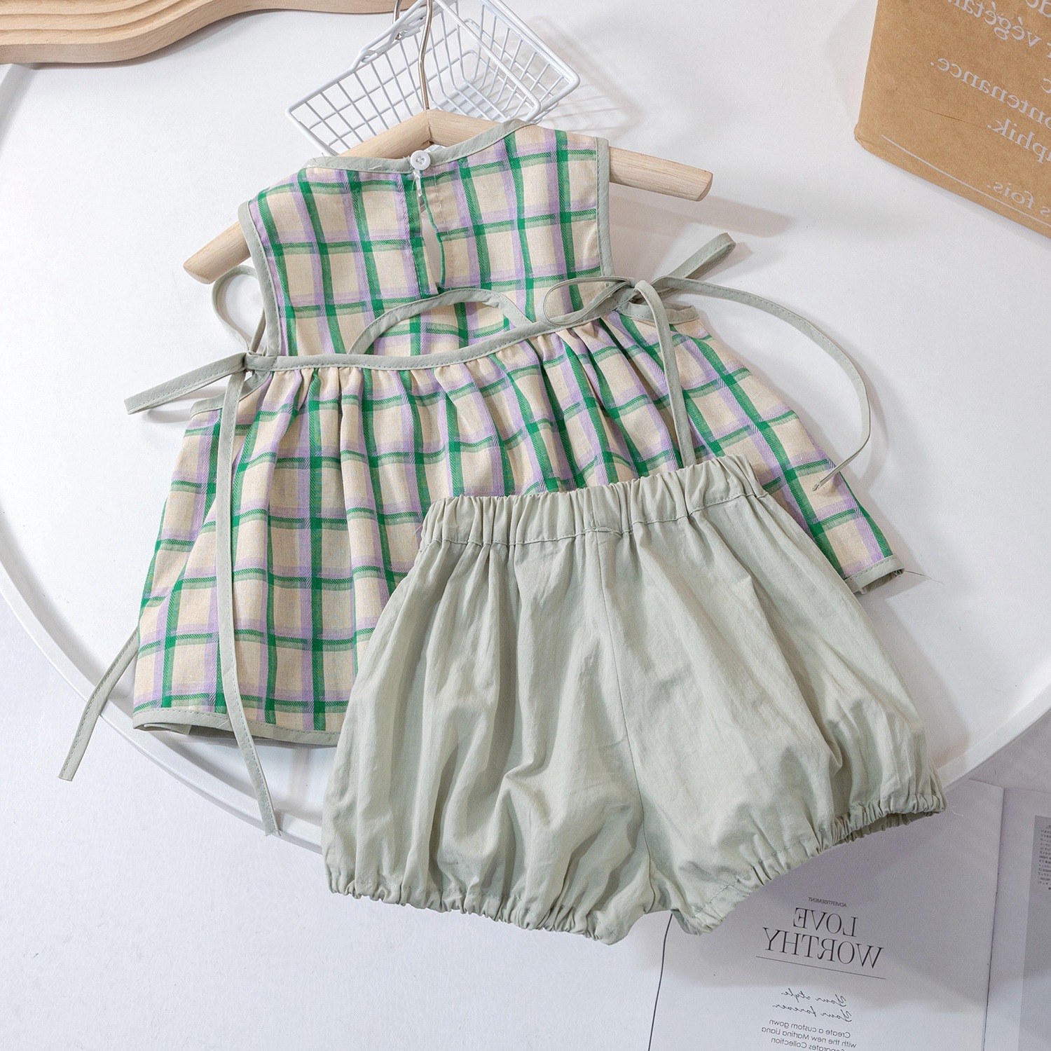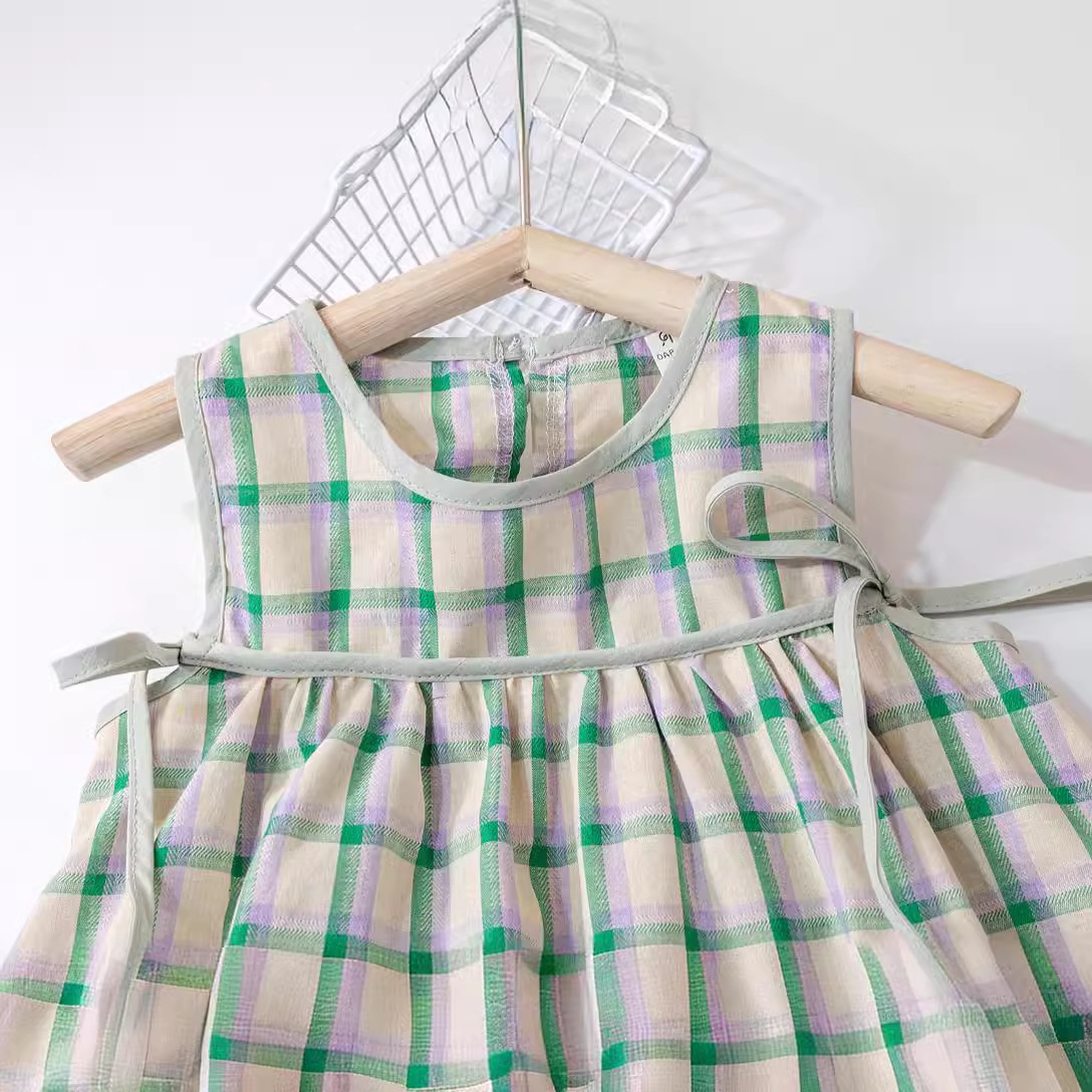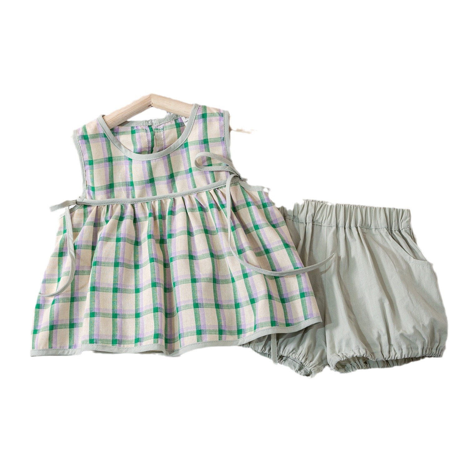 夏季女童套装宝宝洋气儿童个性潮韩版清新格子背心娃娃衫花苞短裤