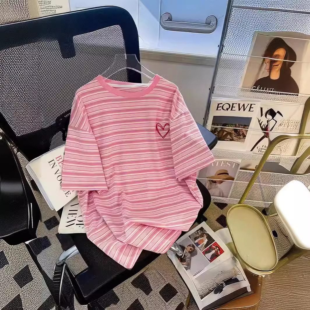 特大码300斤刺绣条纹半袖T恤显瘦时尚休闲设计感夏季半袖ins圆领