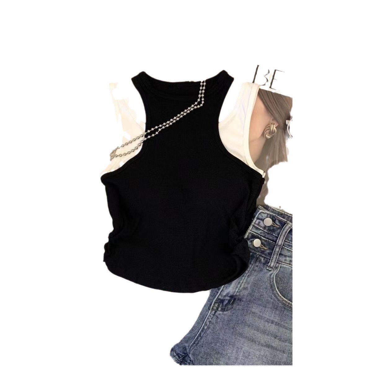 女童夏装背心吊带宝宝洋气儿童个性潮韩版假两件拼色露肩网红上衣