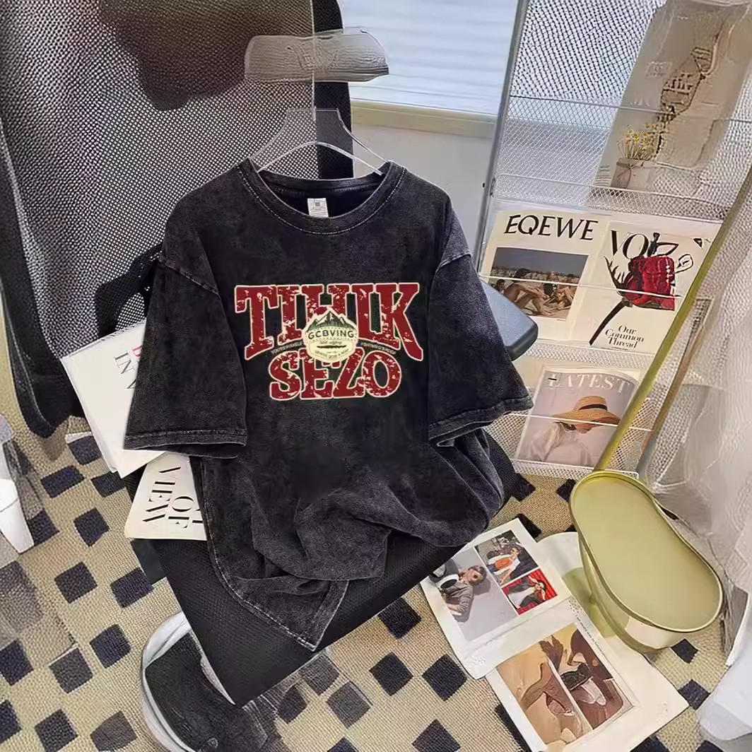 美式复古纯棉短袖t恤女夏季做旧水洗黑宽松独特别致港味chic上衣