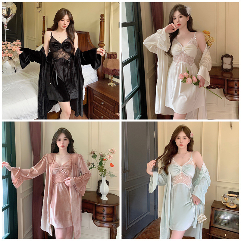 金丝绒睡衣女春秋冬性感吊带蕾丝纯欲风长袖睡袍家居服带胸垫睡袍