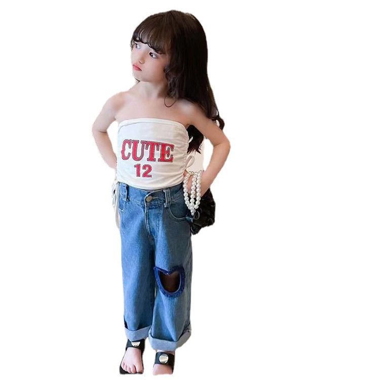 女童夏装背心宝宝洋气儿童个性潮牌港风韩版露肩时髦字母抹胸上衣