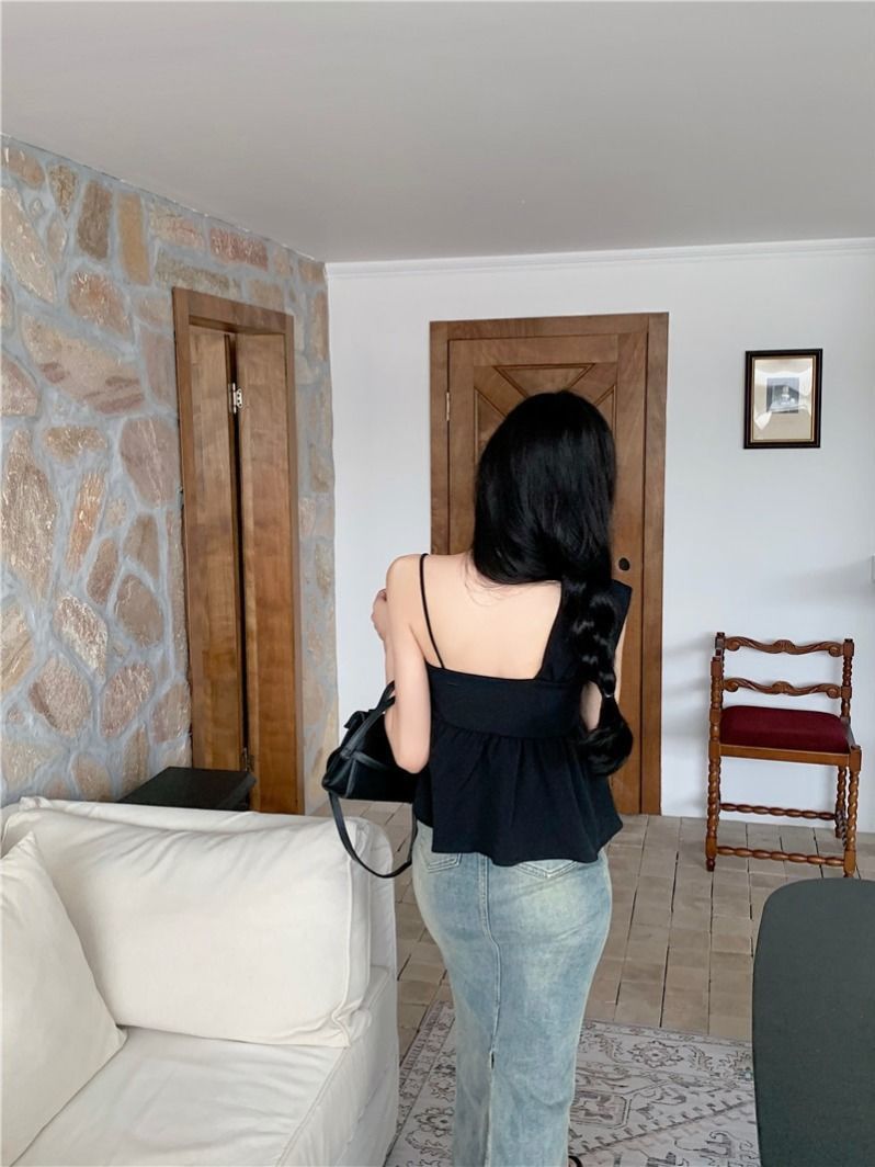 【月销10万】露肩不规则显瘦吊带背心夏季新款黑色时别致短款上衣