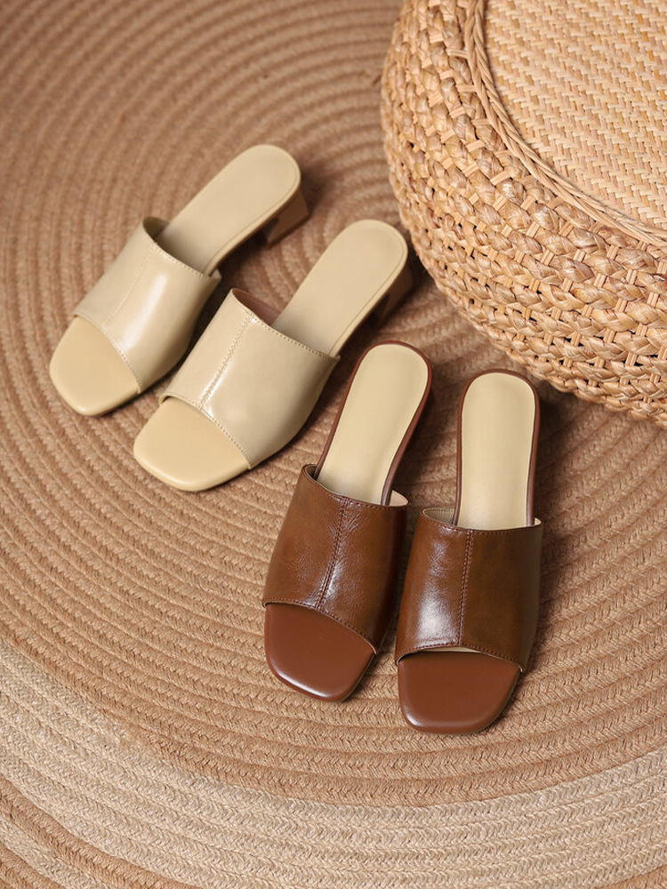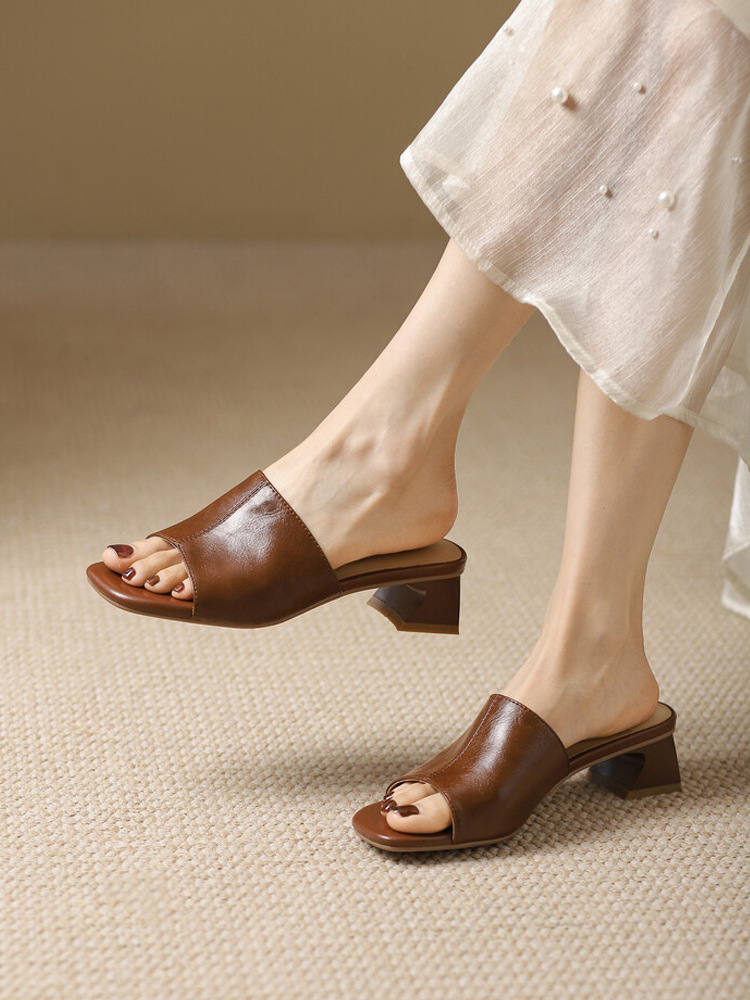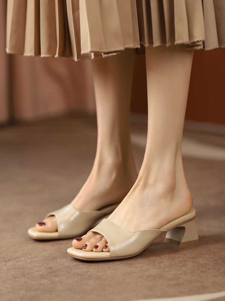 年夏季新款复古中跟ins潮外穿一字鱼嘴粗跟方头妈妈凉拖鞋女