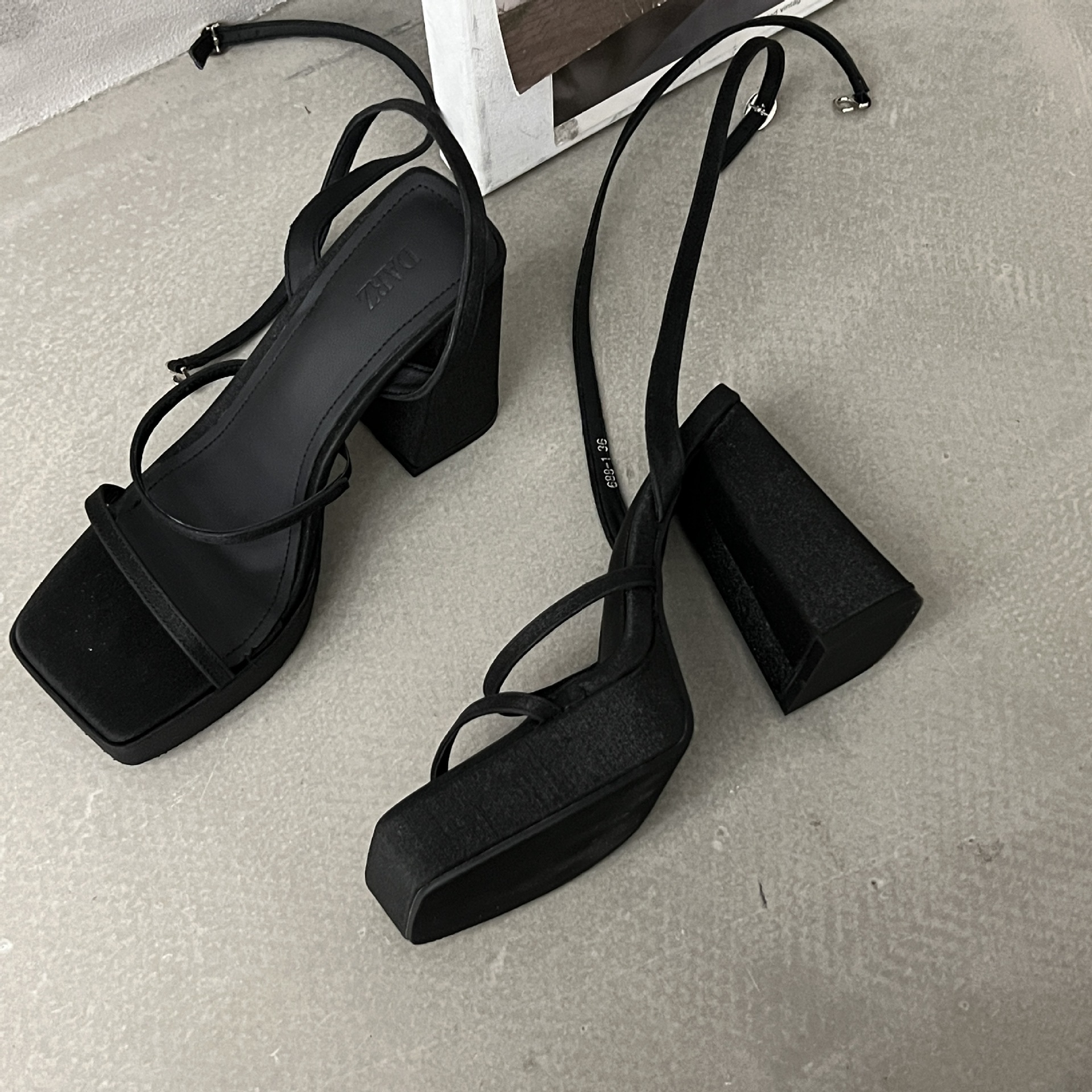 大长腿!防水台露趾一字带粗跟高跟凉鞋女性感绑带增高厚底罗马鞋